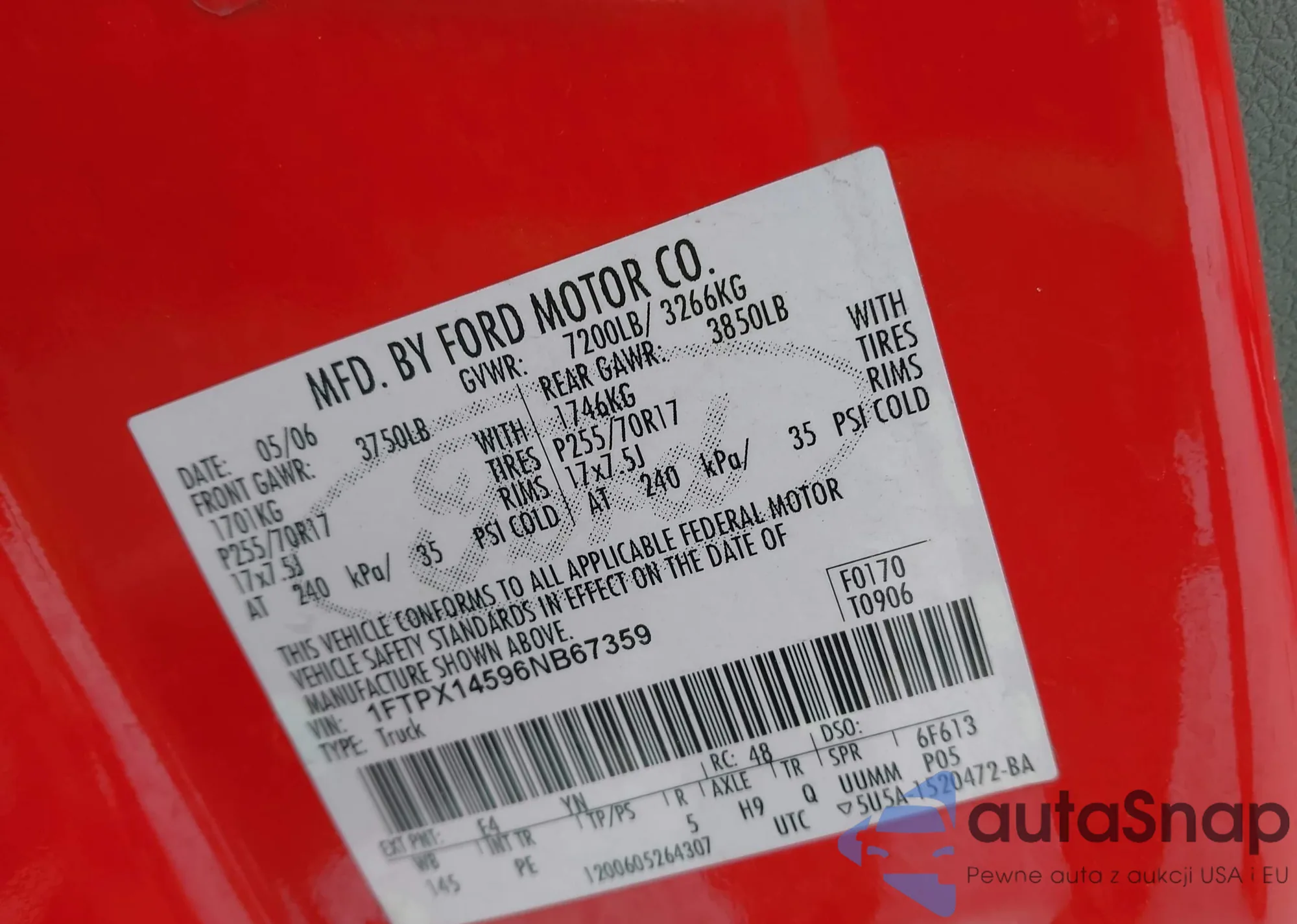 Samochód Ford F-150 2006 (VIN 1FTPX14596NB67359) nie był wcześniej licytowany. Dokumenty są czyste, przebieg odpowiada lub jest niższy niż średnia rynku. Sprzedaje go firma ubezpieczeniowa – polecamy zakup. Dostawa do portu zajmie ok. 6–8 tygodni.