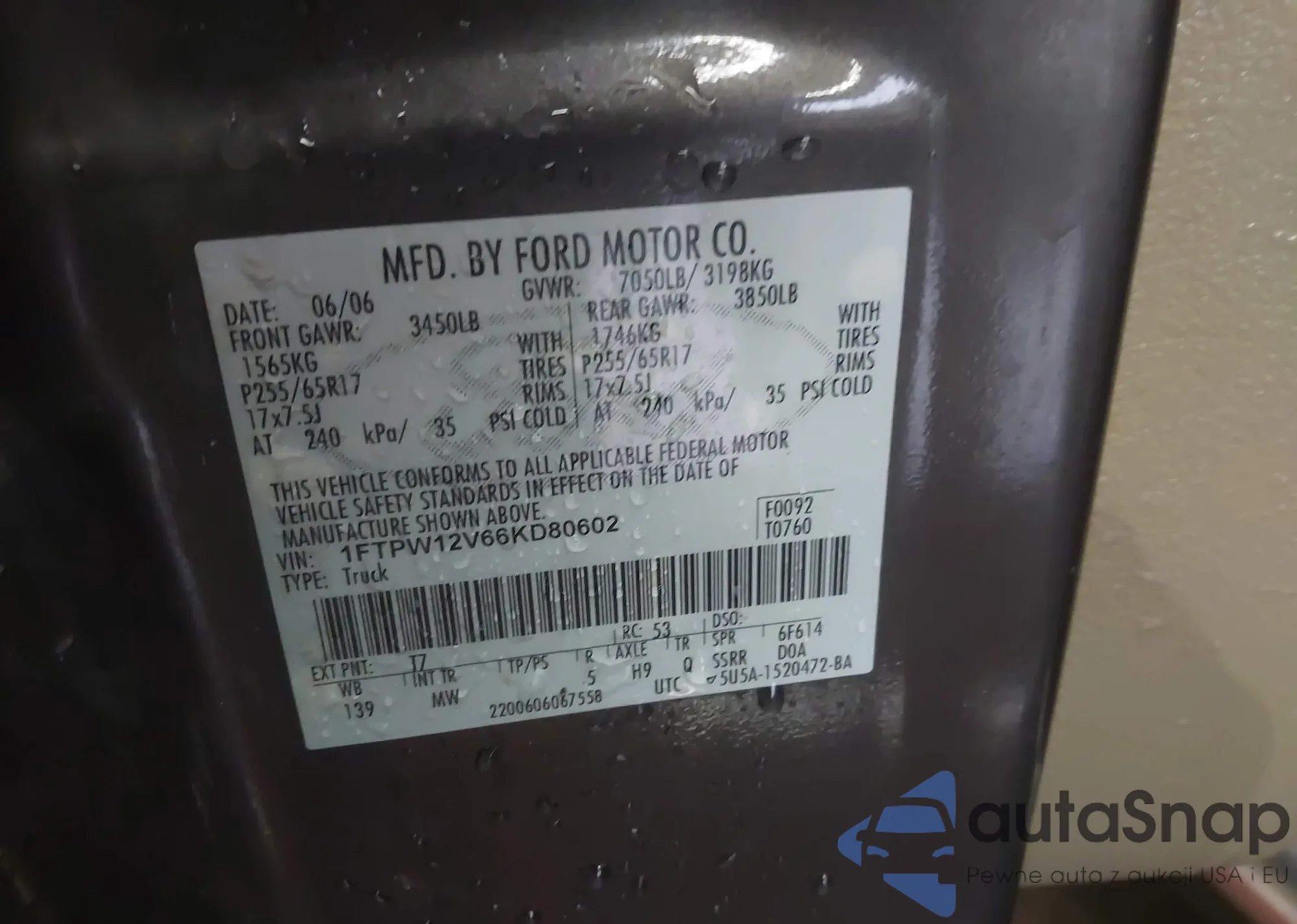• VIN: 1FTPW12V66KD80602