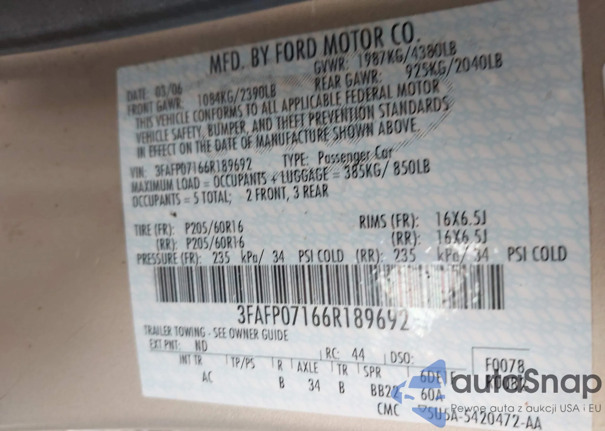 VIN: 3FAFP07166R189692