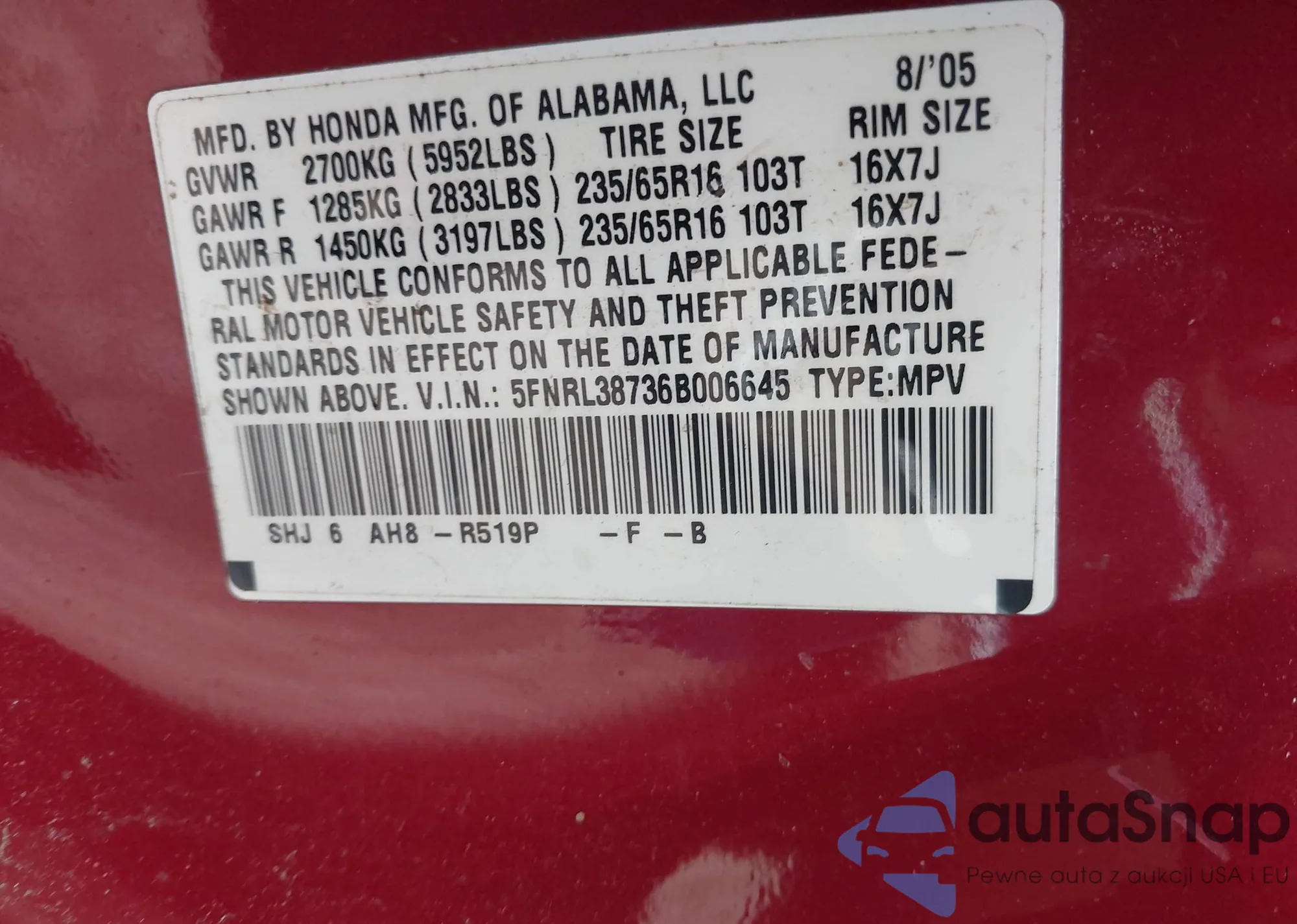 • VIN: 5FNRL38736B006645