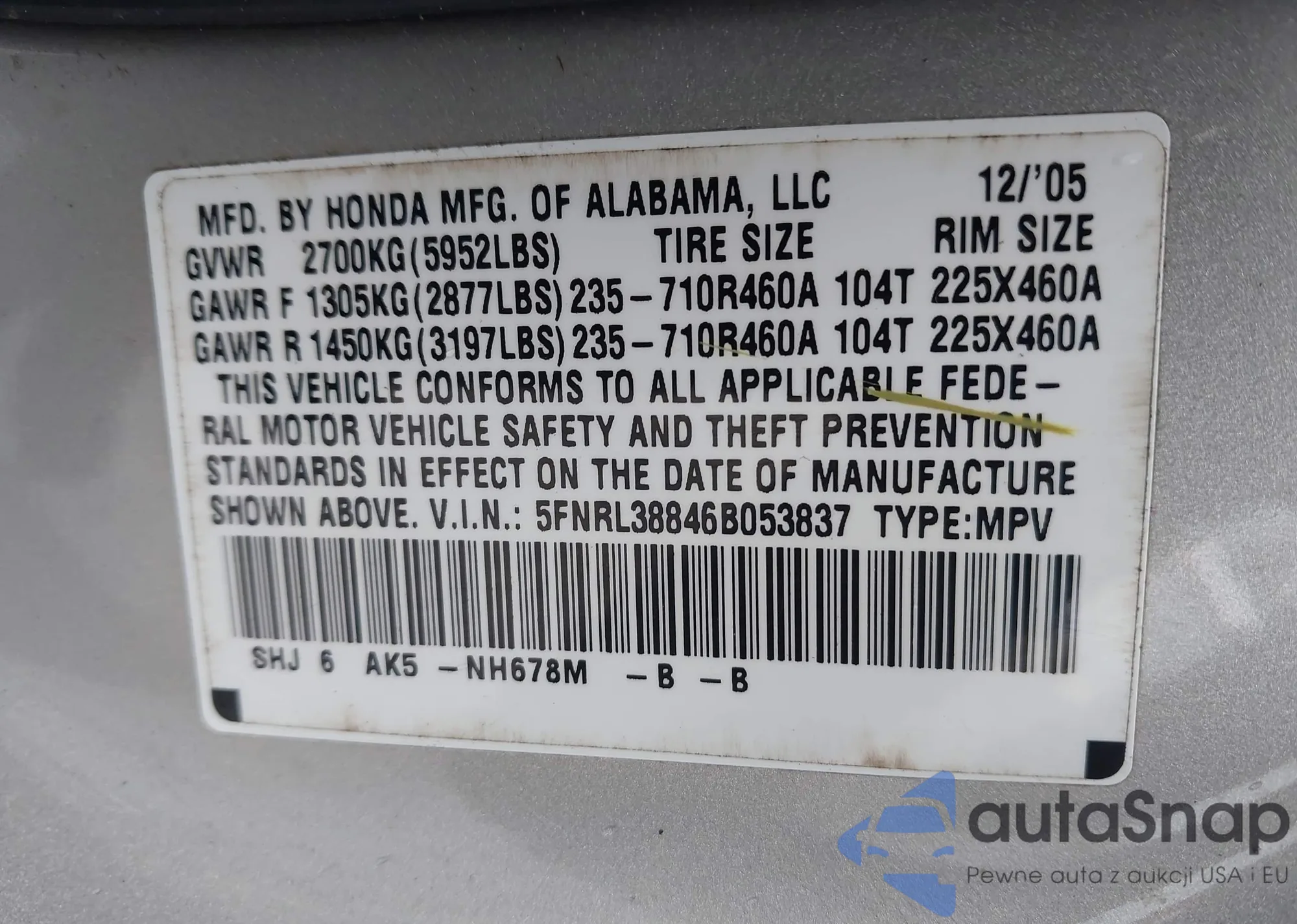 Samochód Honda Odyssey 2006 (VIN 5FNRL38846B053837) ma dokumenty uniemożliwiające rejestrację. Mogą pojawić się trudności przy eksporcie i rejestracji. Skontaktuj się z ekspertami AutaSnap w celu znalezienia alternatywy.