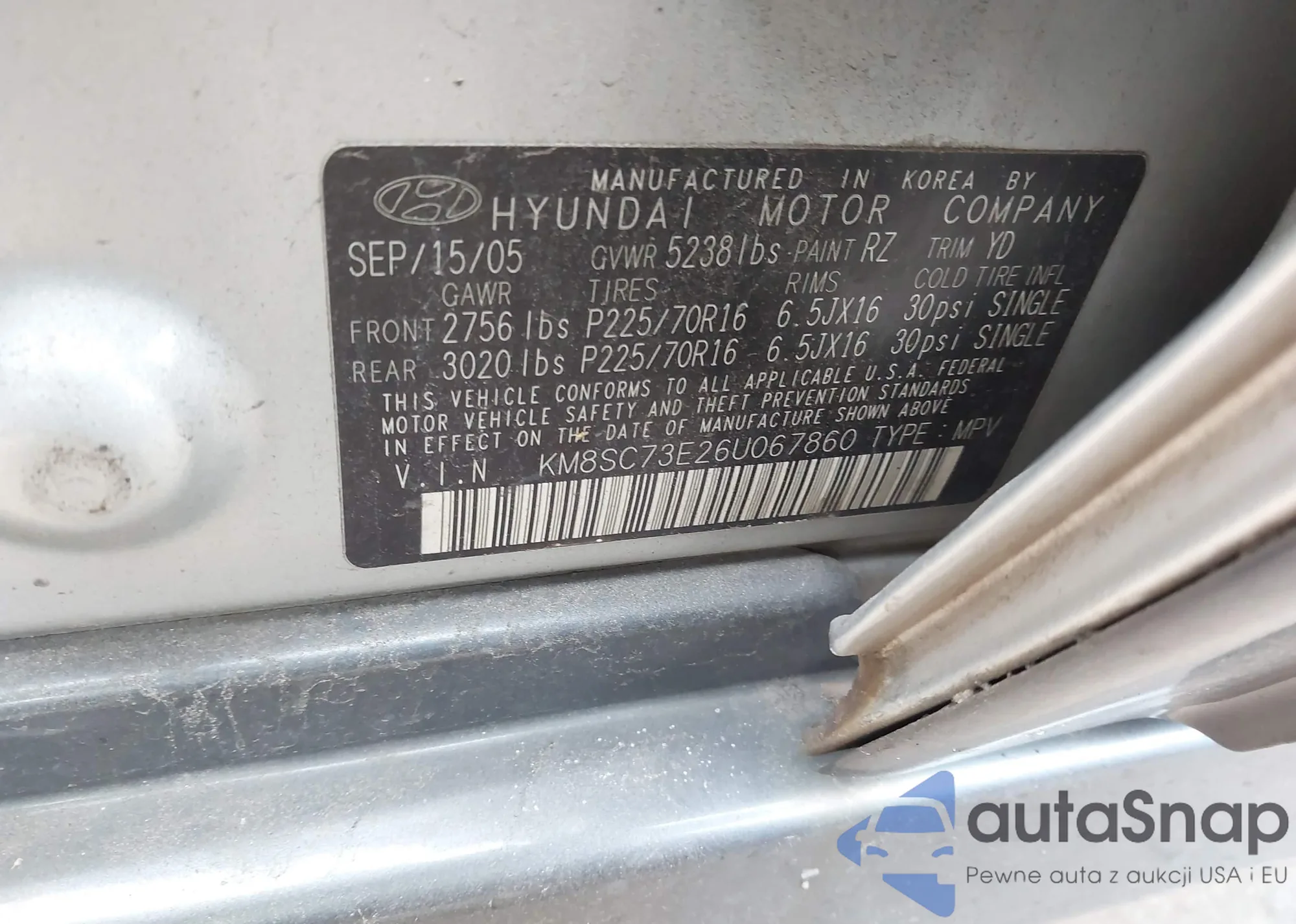 Samochód Hyundai Santa Fe 2006 (VIN KM8SC73E26U067860) ma dokumenty uniemożliwiające rejestrację. Mogą pojawić się trudności przy eksporcie i rejestracji. Skontaktuj się z ekspertami AutaSnap w celu znalezienia alternatywy.