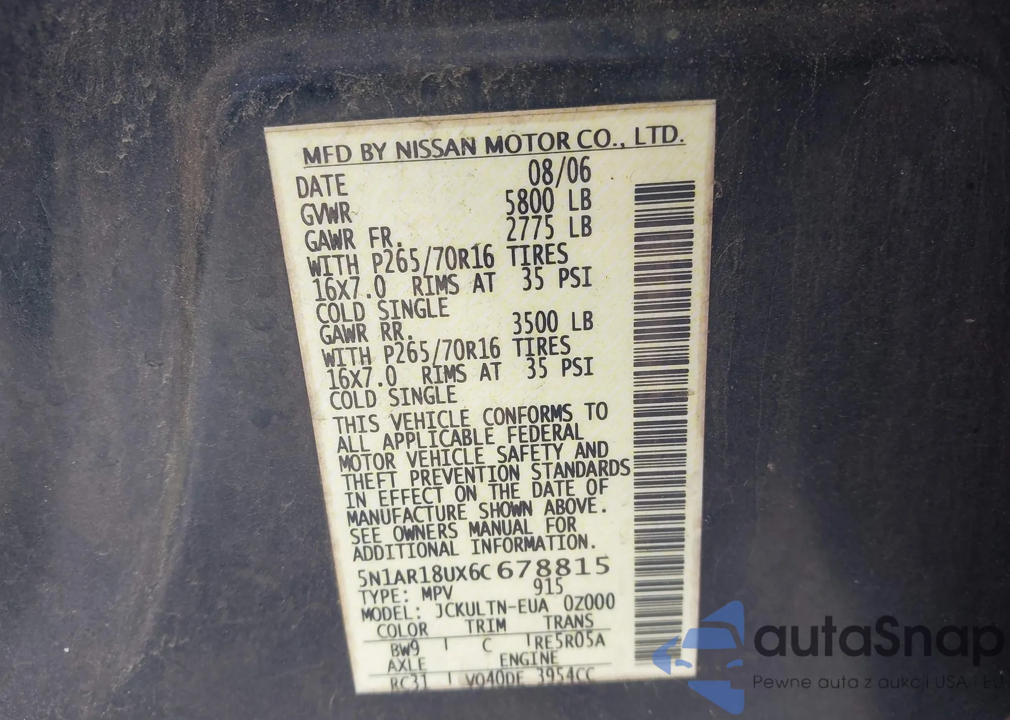 Samochód Nissan Pathfinder 2006 (VIN 5N1AR18UX6C678815) sprzedaje go niezweryfikowany sprzedawca. Zalecamy raport Carfax i potwierdzenie możliwości rejestracji pojazdu przed zakupem.