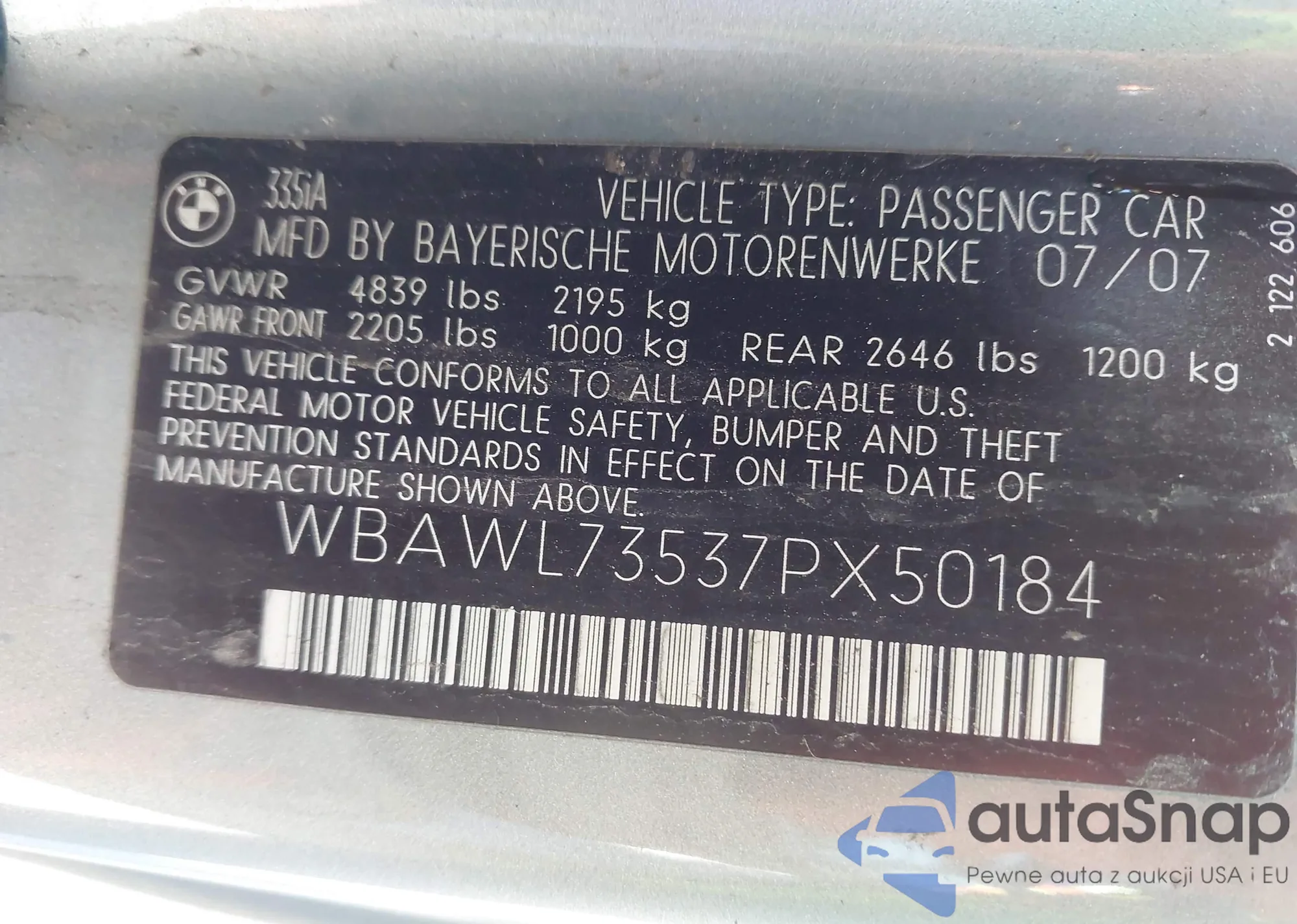 Samochód BMW 3er 2007 (VIN WBAWL73537PX50184) sprzedaje go niezweryfikowany sprzedawca. Zalecamy raport Carfax i potwierdzenie możliwości rejestracji pojazdu przed zakupem.