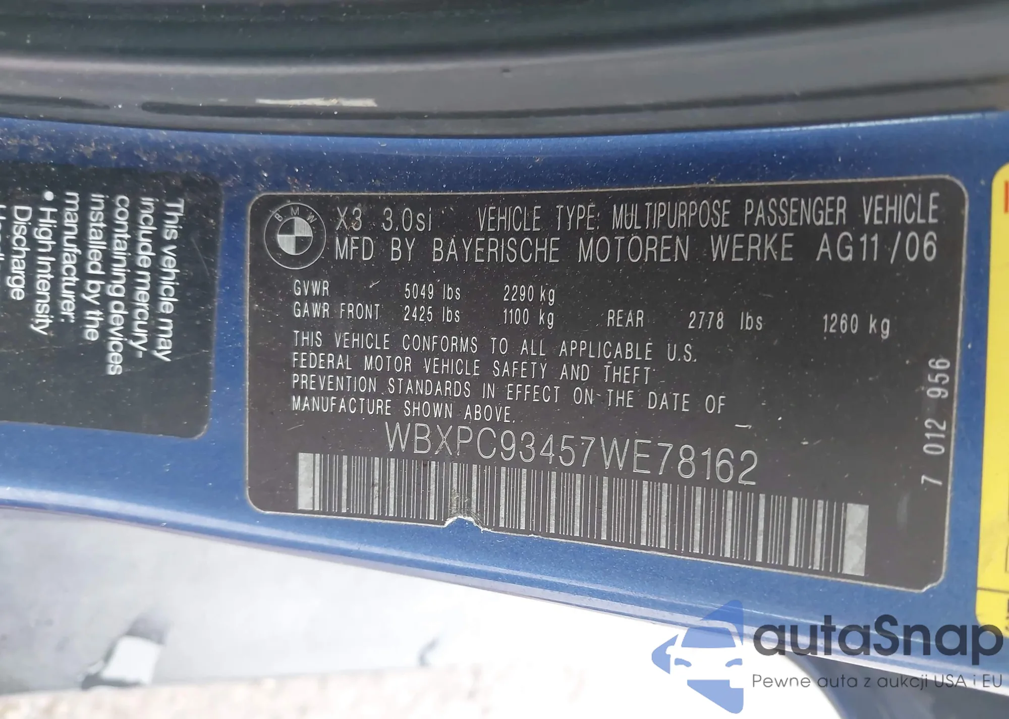 Samochód BMW X3 2007 (VIN WBXPC93457WE78162) sprzedaje go niezweryfikowany sprzedawca. Zalecamy raport Carfax i potwierdzenie możliwości rejestracji pojazdu przed zakupem.