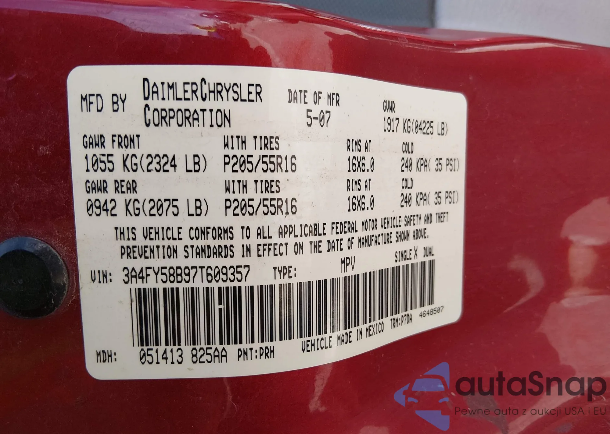 Samochód Chrysler PT Cruiser 2007 (VIN 3A4FY58B97T609357) nie był wcześniej licytowany. Dokumenty są czyste, przebieg odpowiada lub jest niższy niż średnia rynku. Sprzedaje go firma ubezpieczeniowa – polecamy zakup. Dostawa do portu zajmie ok. 6–8 tygodni.