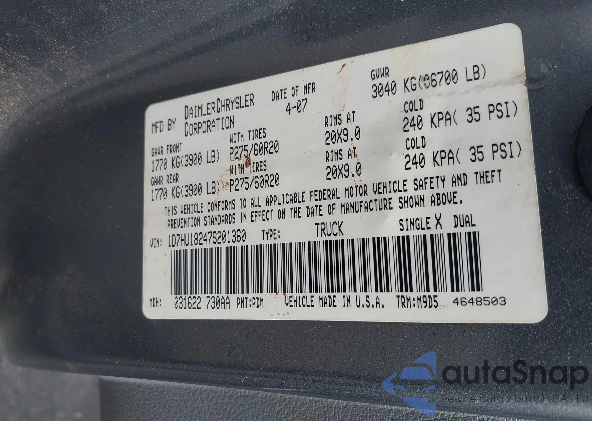 Samochód Dodge RAM 2007 (VIN 1D7HU18247S201360) sprzedaje go niezweryfikowany sprzedawca. Zalecamy raport Carfax i potwierdzenie możliwości rejestracji pojazdu przed zakupem.