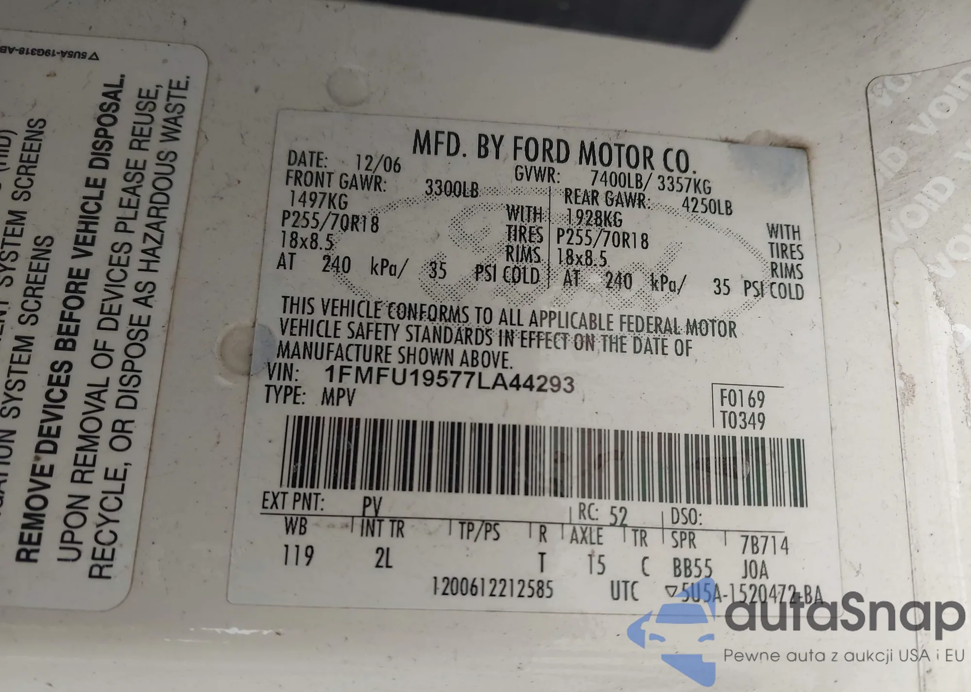 • VIN: 1FMFU19577LA44293