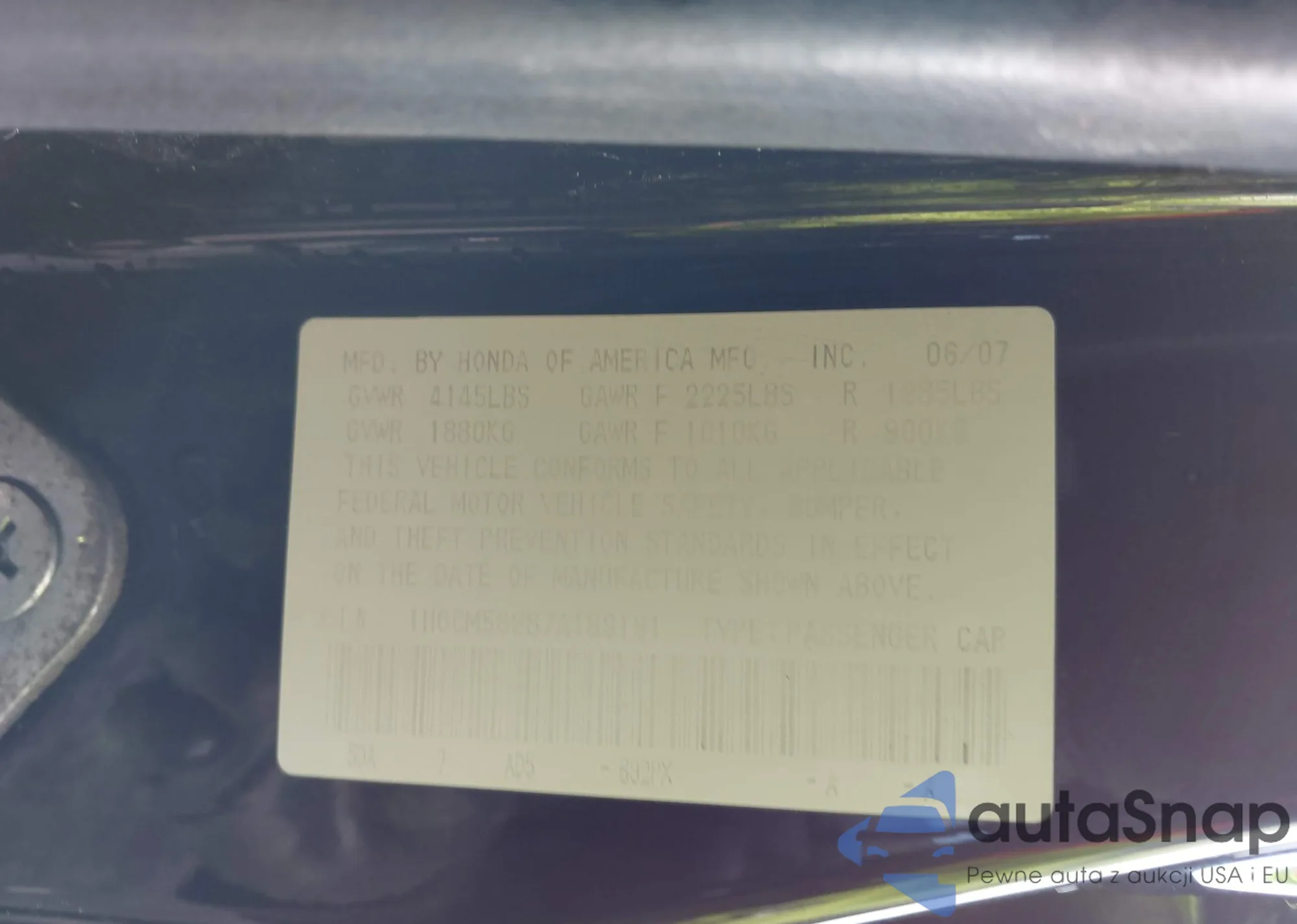 Samochód Honda Accord 2007 (VIN 1HGCM56887A189191) ma dokumenty uniemożliwiające rejestrację. Mogą pojawić się trudności przy eksporcie i rejestracji. Skontaktuj się z ekspertami AutaSnap w celu znalezienia alternatywy.
