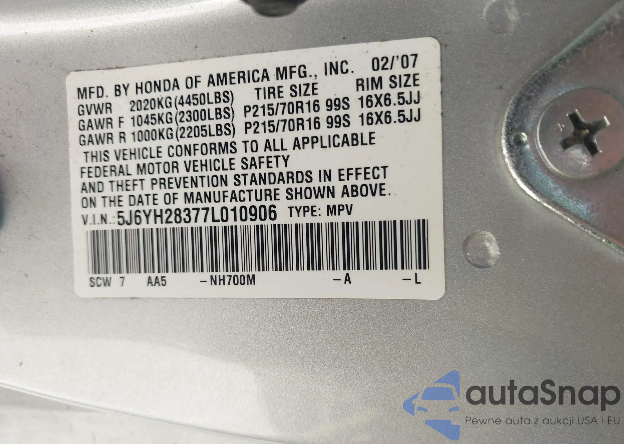 VIN: 5J6YH28377L010906