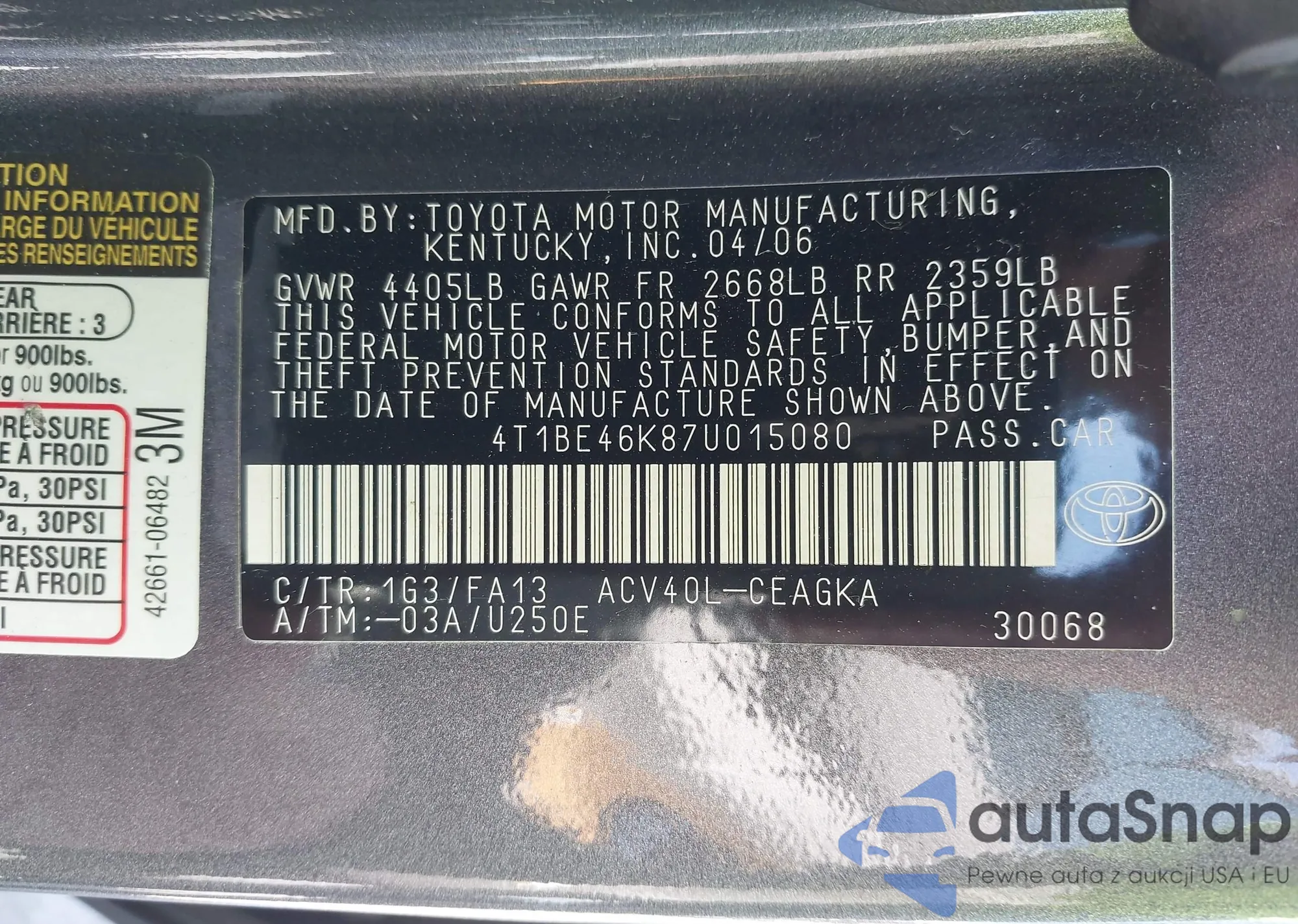 Samochód Toyota Camry 2007 (VIN 4T1BE46K87U015080) sprzedaje go niezweryfikowany sprzedawca. Zalecamy raport Carfax i potwierdzenie możliwości rejestracji pojazdu przed zakupem.