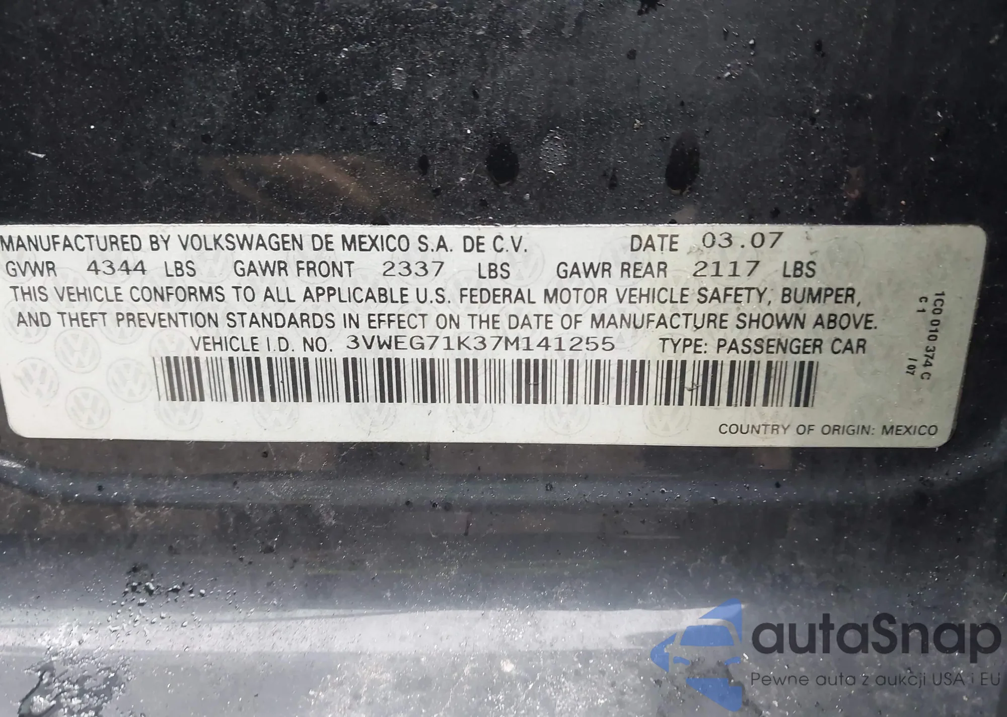 • VIN: 3VWEG71K37M141255