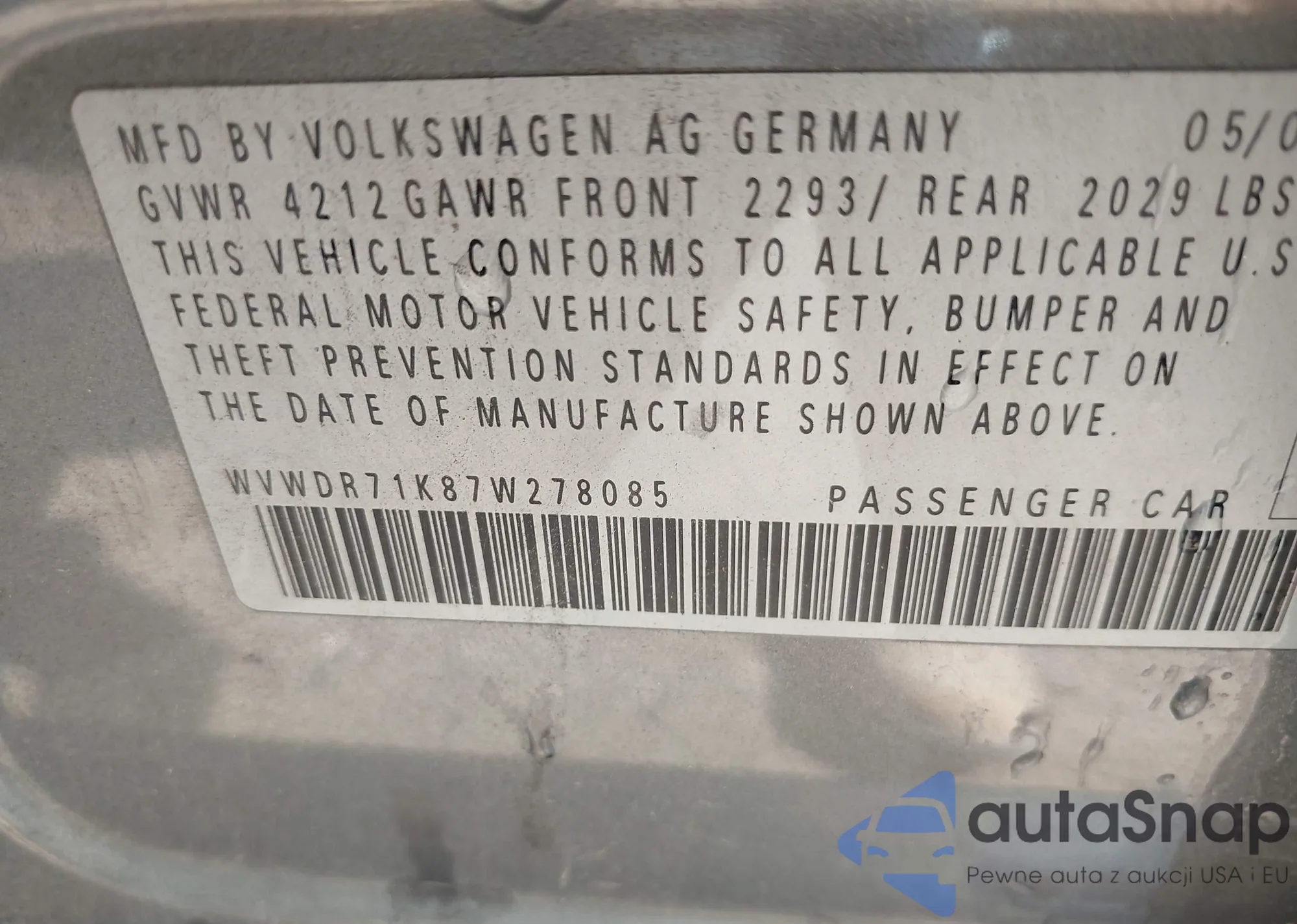VIN: WVWDR71K87W278085