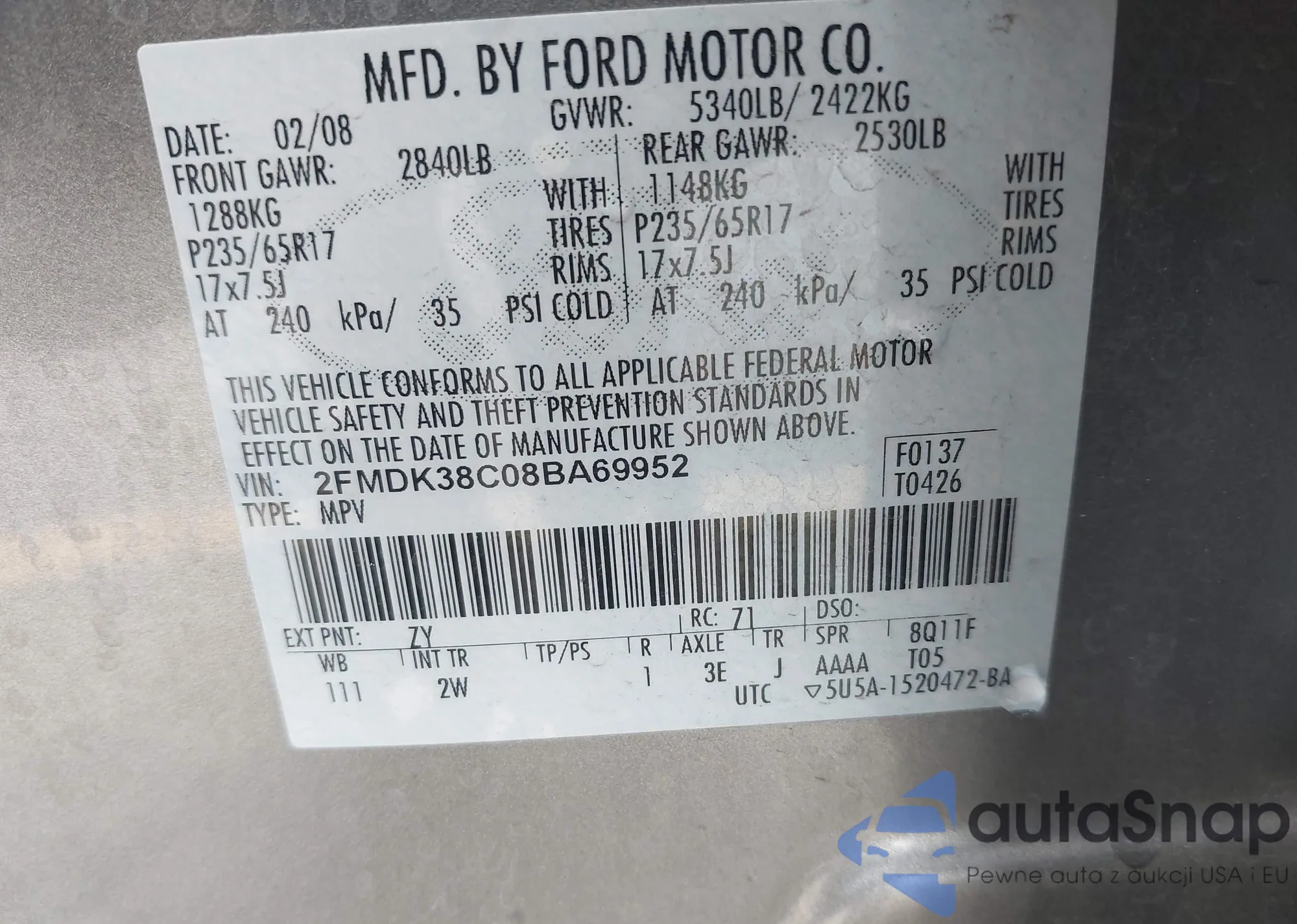 VIN: 2FMDK38C08BA69952