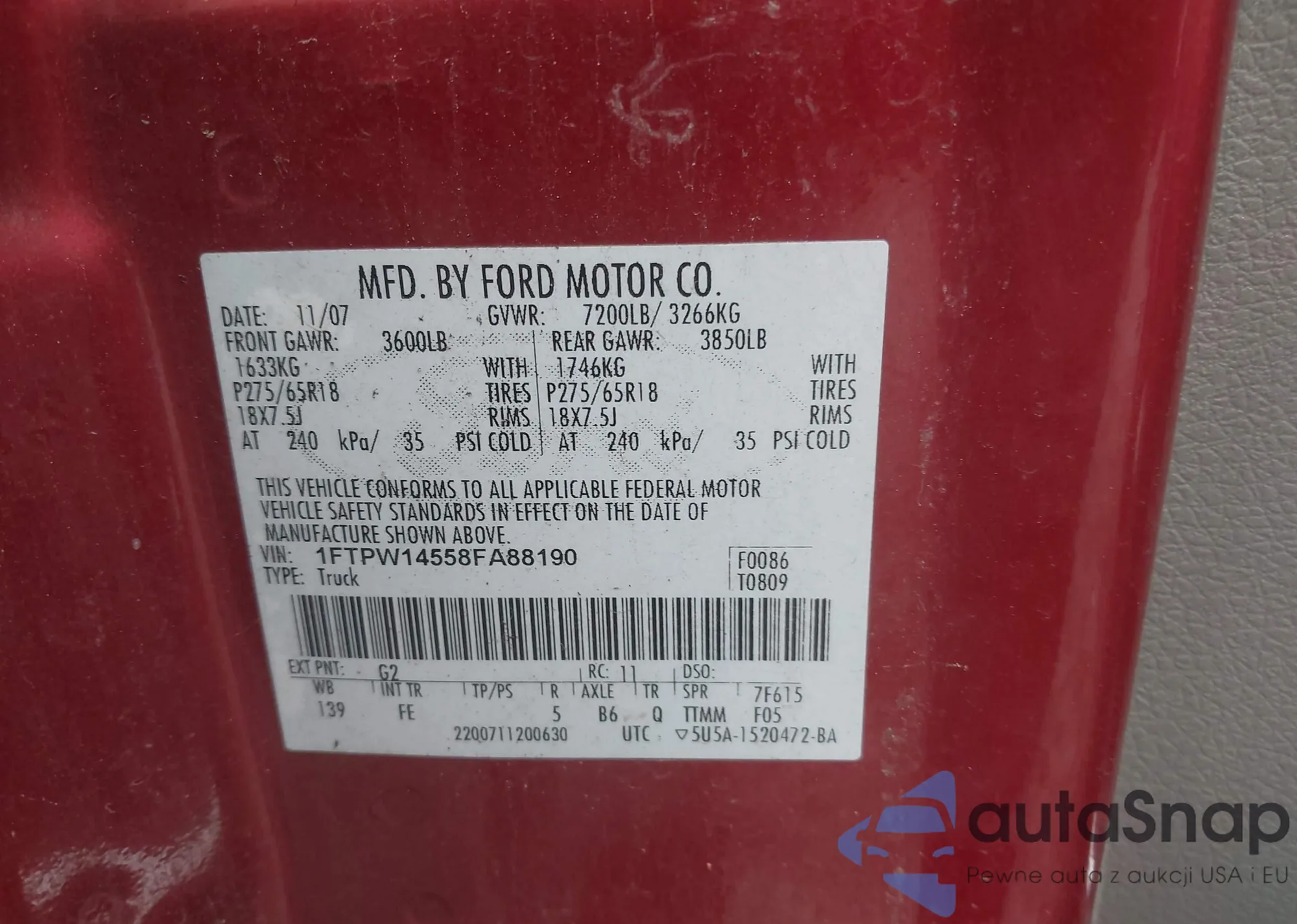 • VIN: 1FTPW14558FA88190