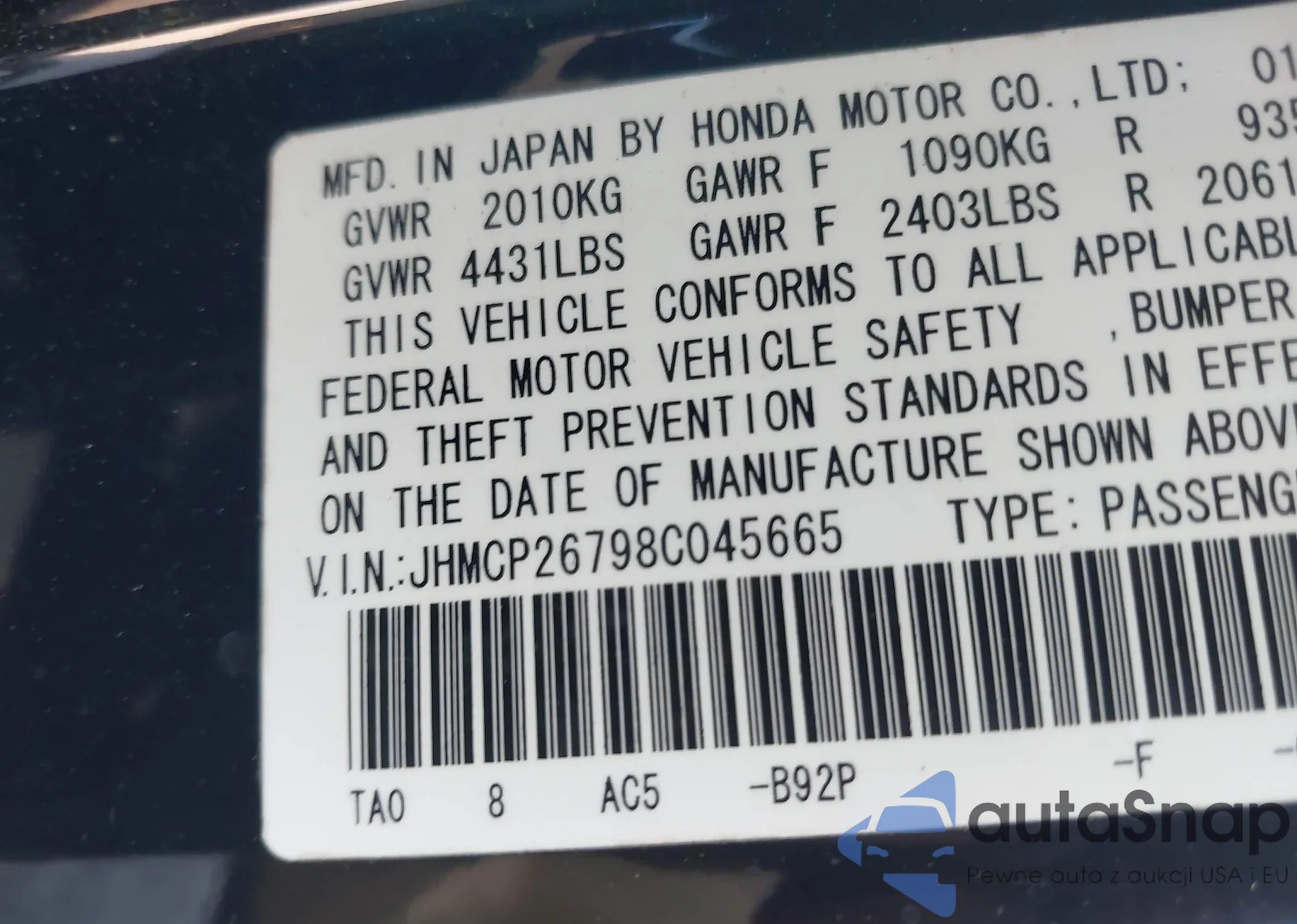 • VIN: JHMCP26798C045665