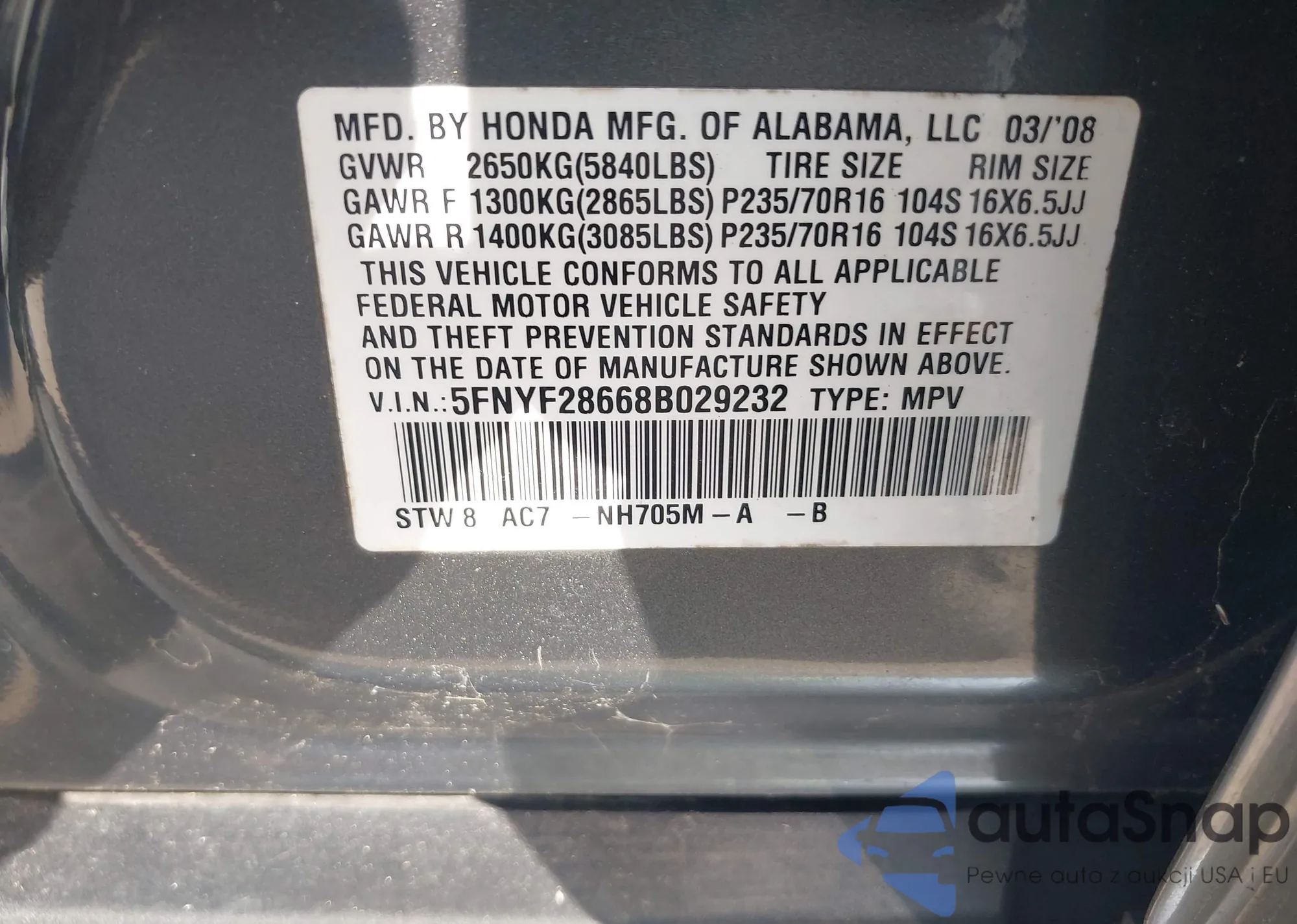 VIN: 5FNYF28668B029232