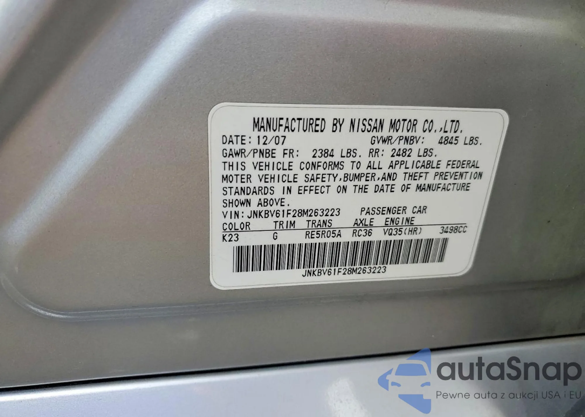 Samochód Infiniti G 2008 (VIN JNKBV61F28M263223) sprzedaje go niezweryfikowany sprzedawca. Zalecamy raport Carfax i potwierdzenie możliwości rejestracji pojazdu przed zakupem.