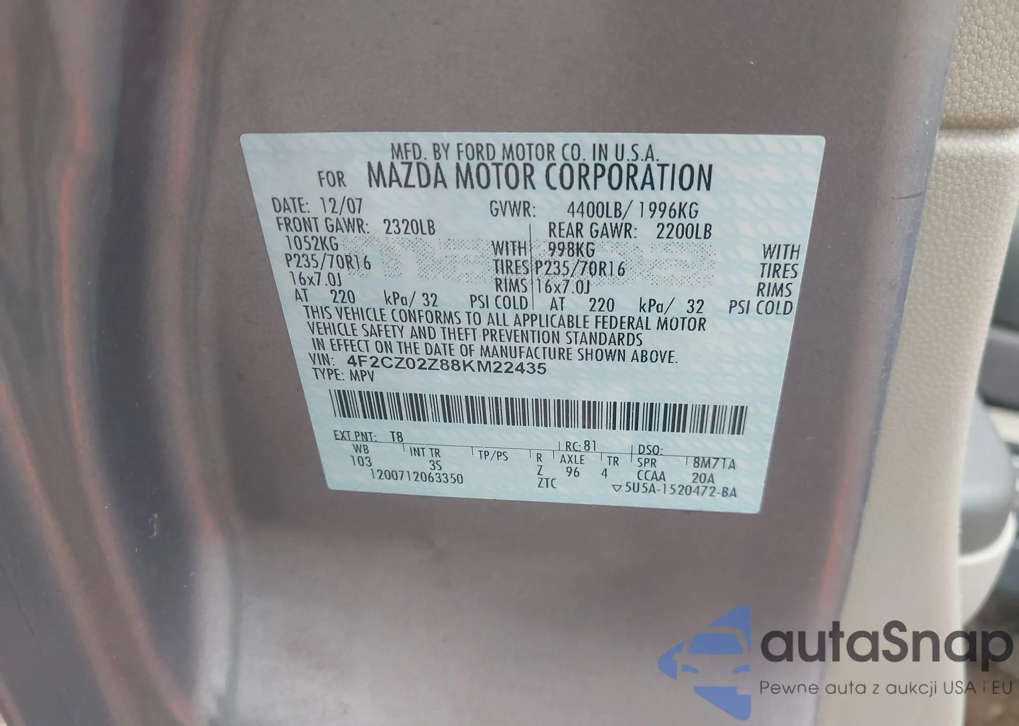 Samochód Mazda Tribute 2008 (VIN 4F2CZ02Z88KM22435) sprzedaje go niezweryfikowany sprzedawca. Zalecamy raport Carfax i potwierdzenie możliwości rejestracji pojazdu przed zakupem.