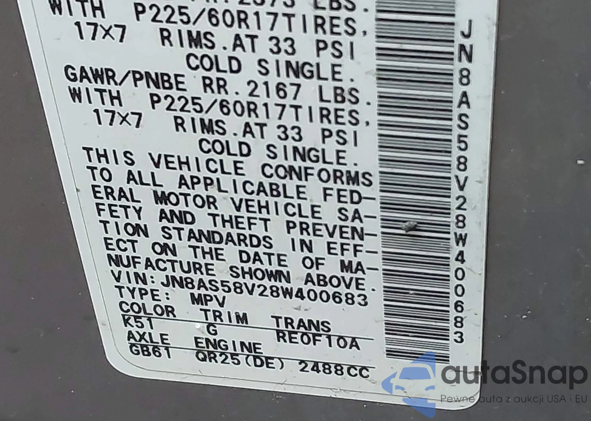 • VIN: JN8AS58V28W400683