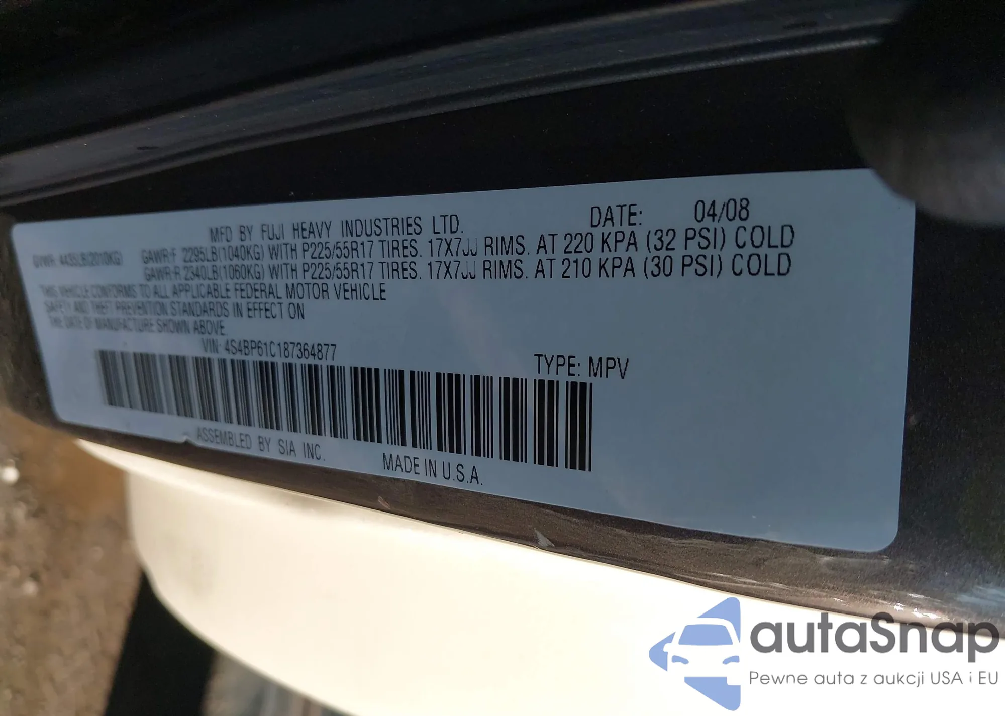Samochód Subaru Outback 2008 (VIN 4S4BP61C187364877) nie był wcześniej licytowany. Dokumenty są czyste, przebieg odpowiada lub jest niższy niż średnia rynku. Sprzedaje go firma ubezpieczeniowa – polecamy zakup. Dostawa do portu zajmie ok. 6–8 tygodni.