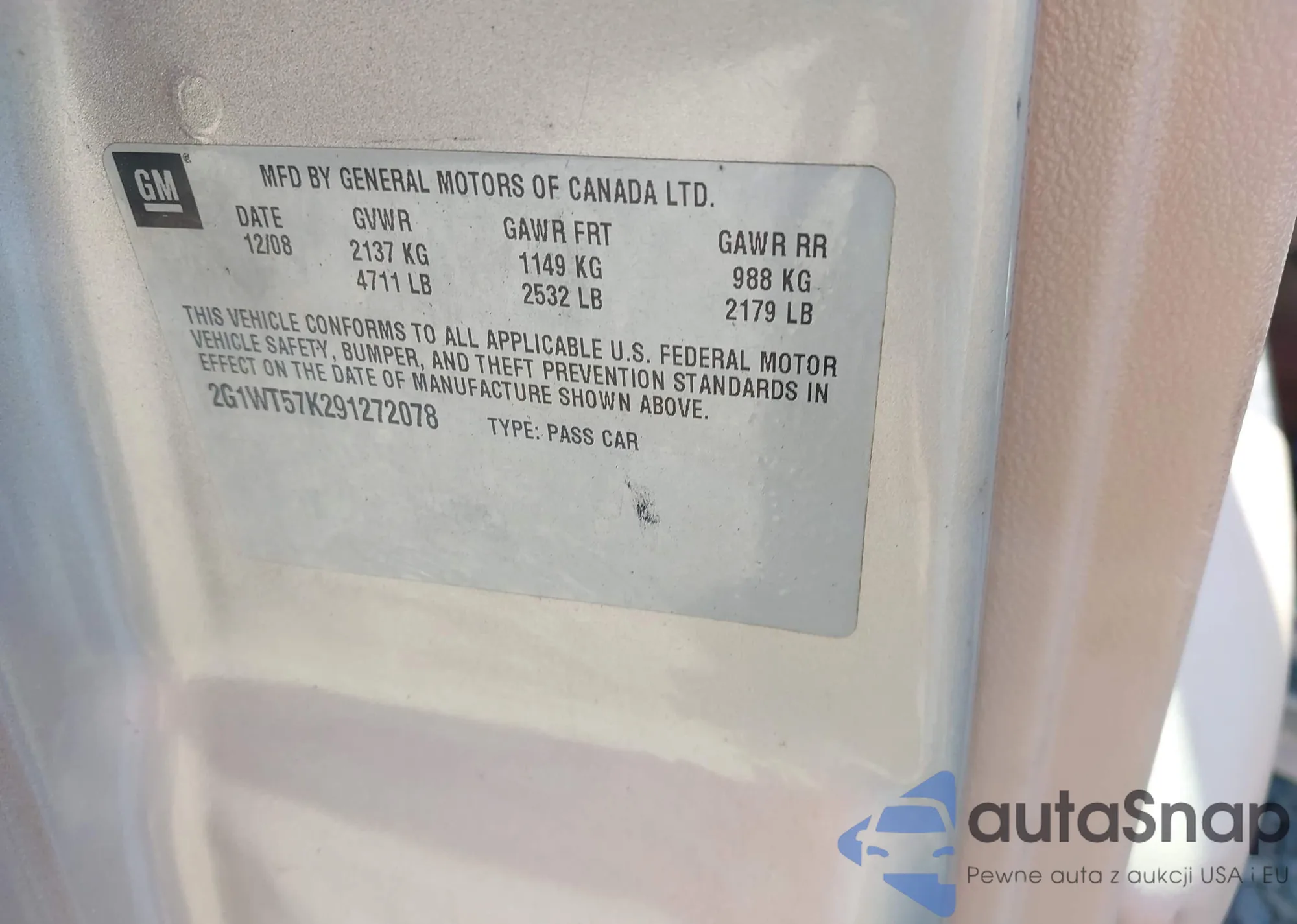 VIN: 2G1WT57K291272078