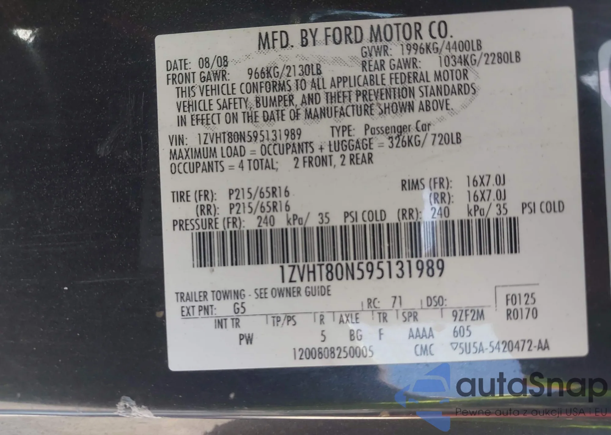 Samochód Ford Mustang 2009 (VIN 1ZVHT80N595131989) nie był wcześniej licytowany. Dokumenty są czyste, przebieg odpowiada lub jest niższy niż średnia rynku. Sprzedaje go firma ubezpieczeniowa – polecamy zakup. Dostawa do portu zajmie ok. 6–8 tygodni.