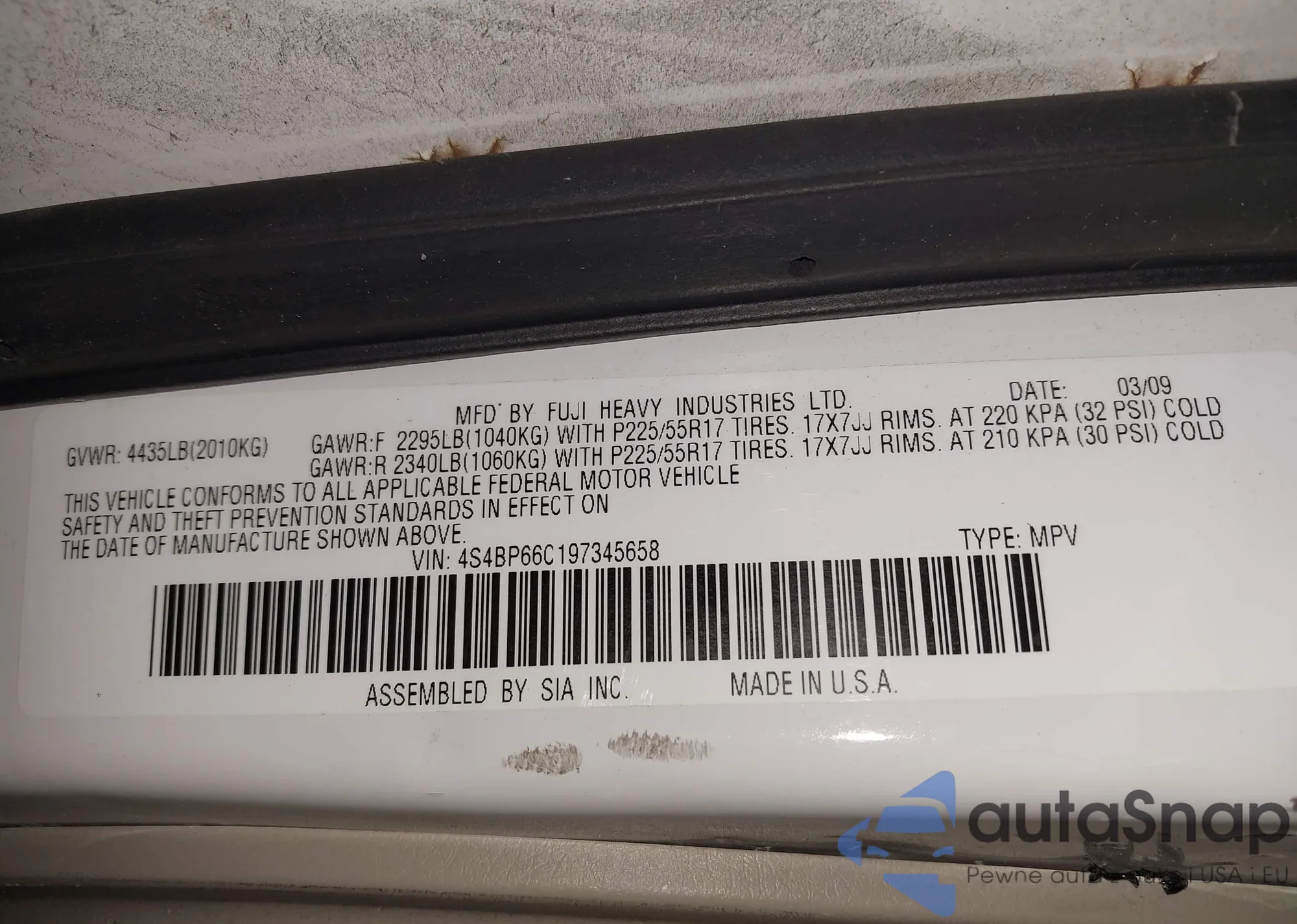 Samochód Subaru Outback 2009 (VIN 4S4BP66C197345658) sprzedaje go niezweryfikowany sprzedawca. Zalecamy raport Carfax i potwierdzenie możliwości rejestracji pojazdu przed zakupem.