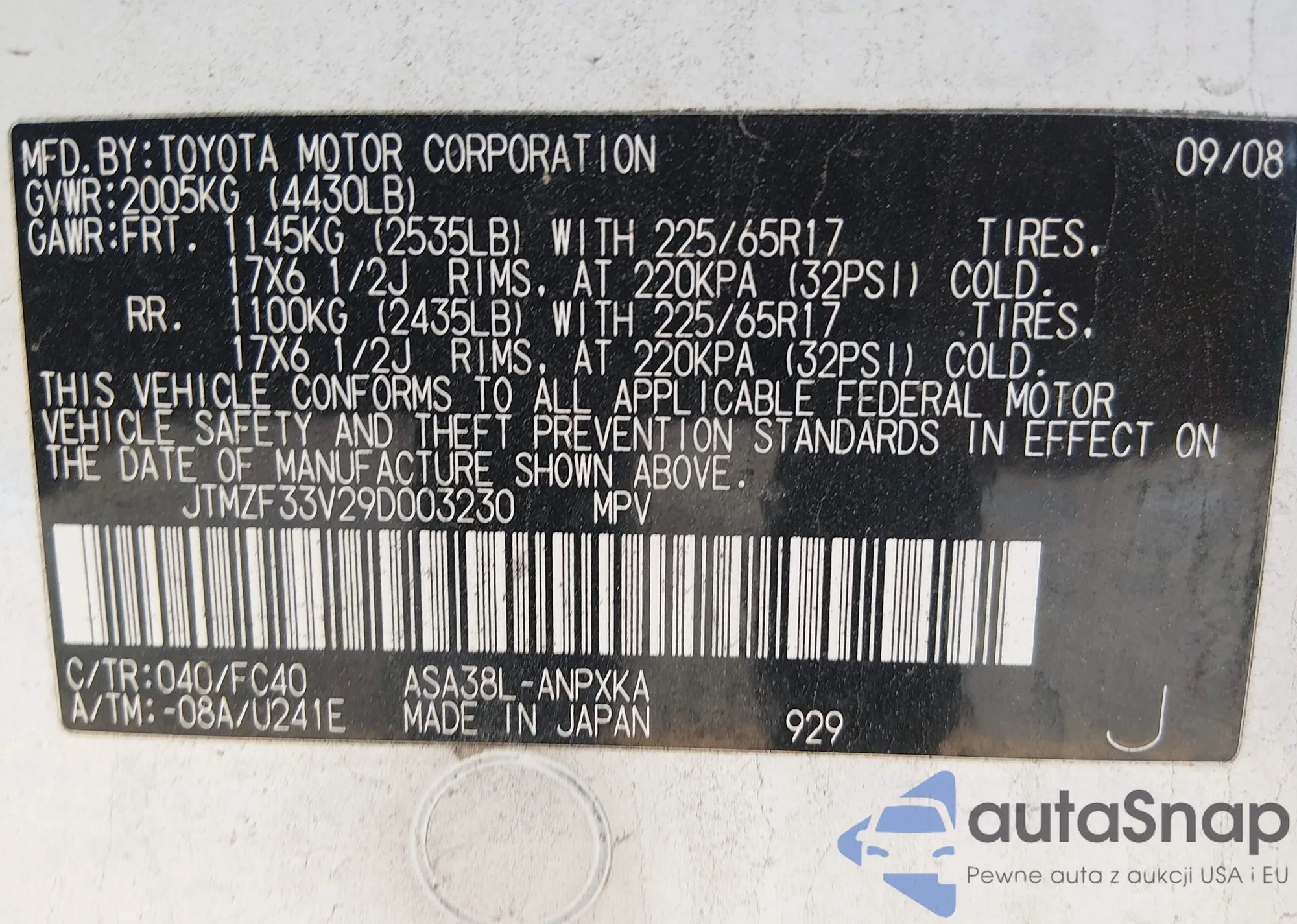 Samochód Toyota RAV 4 2009 (VIN JTMZF33V29D003230) nie był wcześniej licytowany. Dokumenty są czyste, przebieg odpowiada lub jest niższy niż średnia rynku. Sprzedaje go firma ubezpieczeniowa – polecamy zakup. Dostawa do portu zajmie ok. 6–8 tygodni.