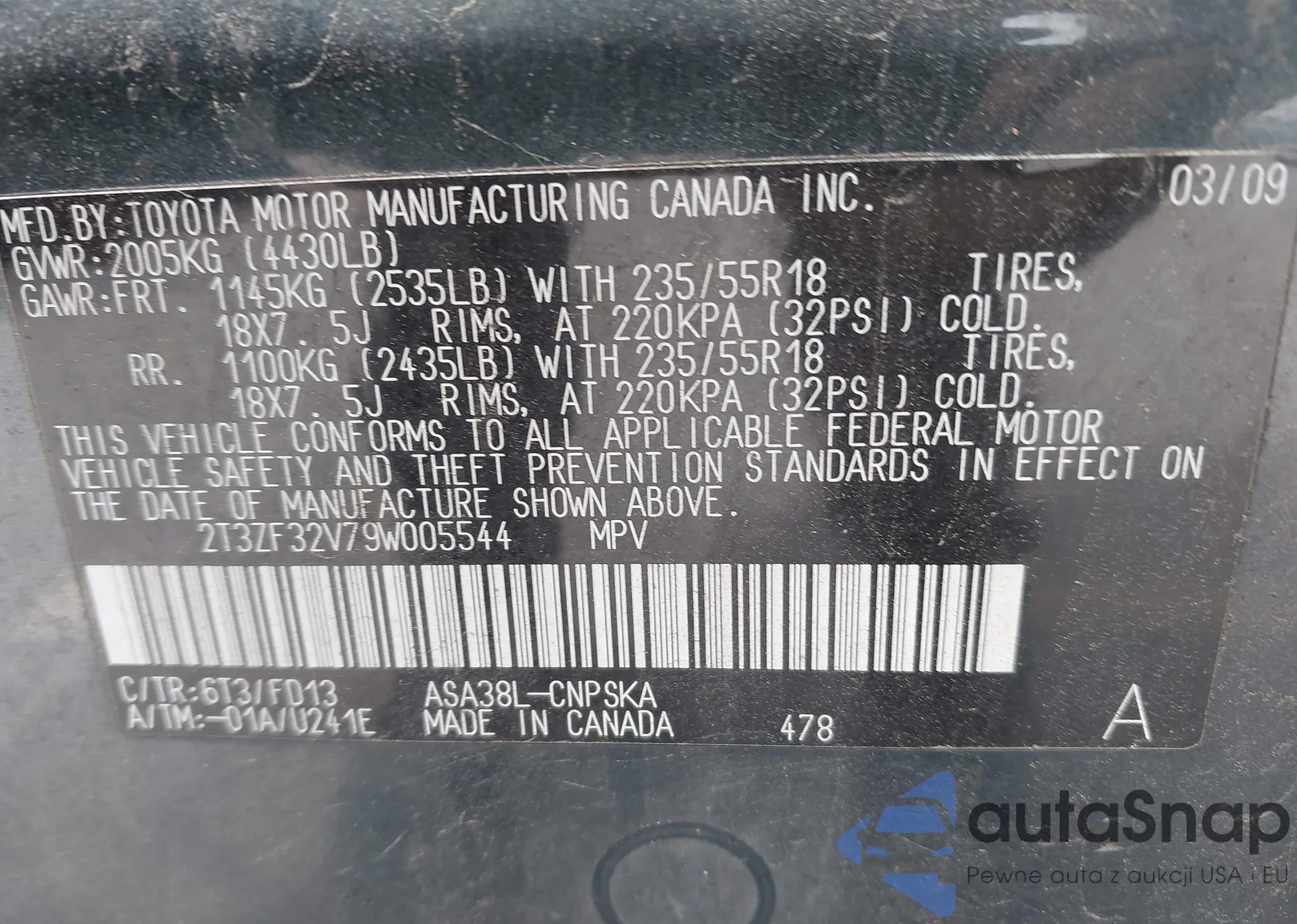 Samochód Toyota RAV 4 2009 (VIN 2T3ZF32V79W005544) sprzedaje go niezweryfikowany sprzedawca. Zalecamy raport Carfax i potwierdzenie możliwości rejestracji pojazdu przed zakupem.