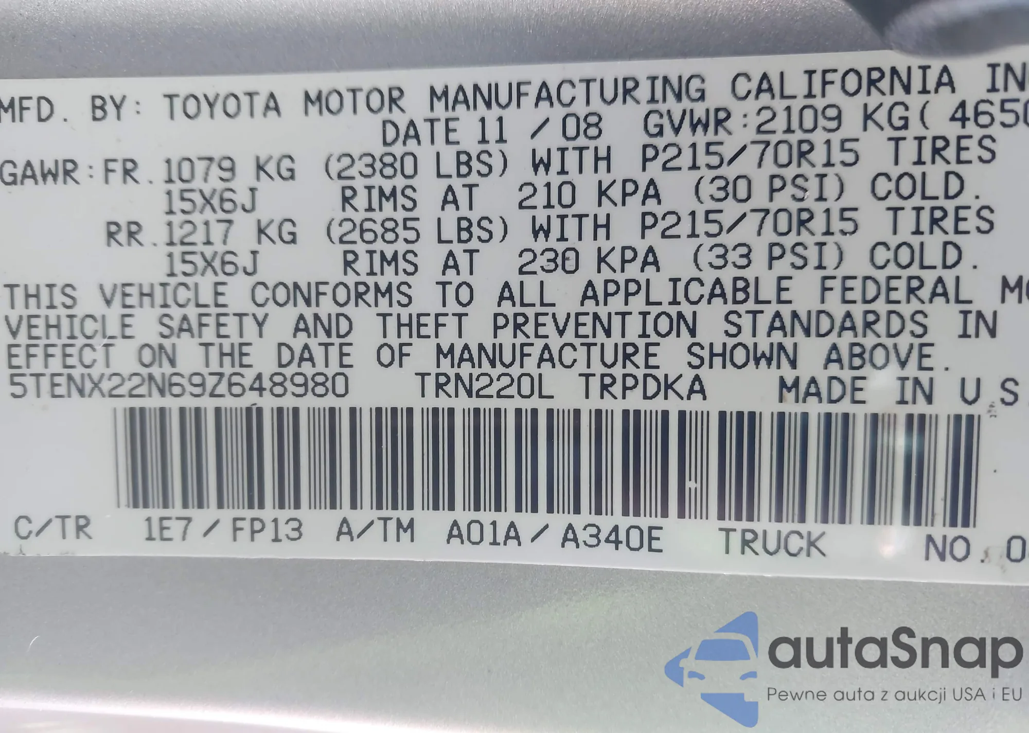 • VIN: 5TENX22N69Z648980