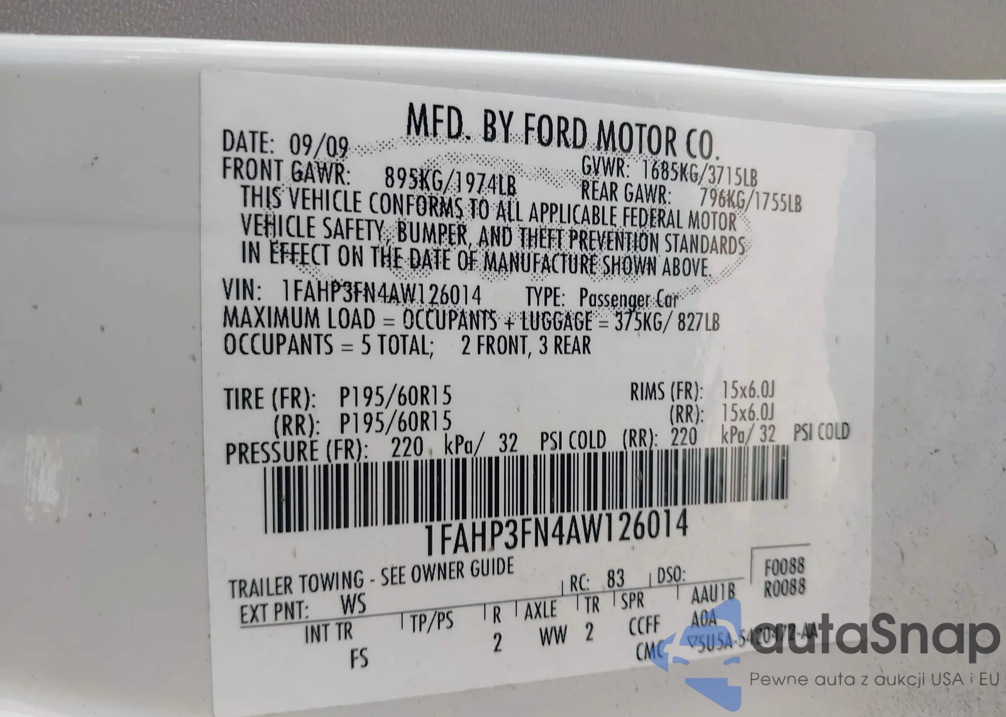 • VIN: 1FAHP3FN4AW126014