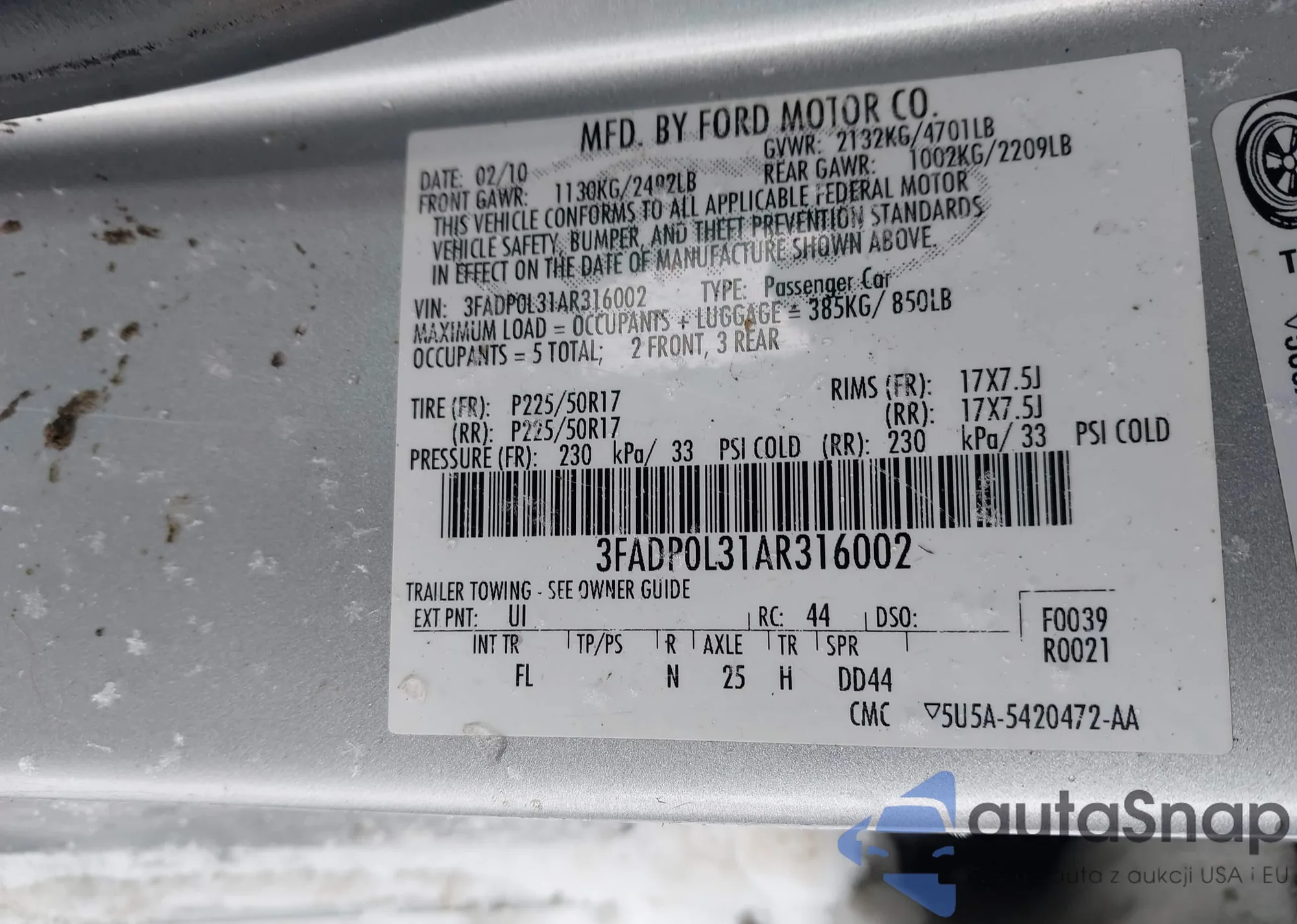Samochód Ford Fusion 2010 (VIN 3FADP0L31AR316002) nie był wcześniej licytowany. Dokumenty są czyste, przebieg odpowiada lub jest niższy niż średnia rynku. Sprzedaje go firma ubezpieczeniowa – polecamy zakup. Dostawa do portu zajmie ok. 6–8 tygodni.