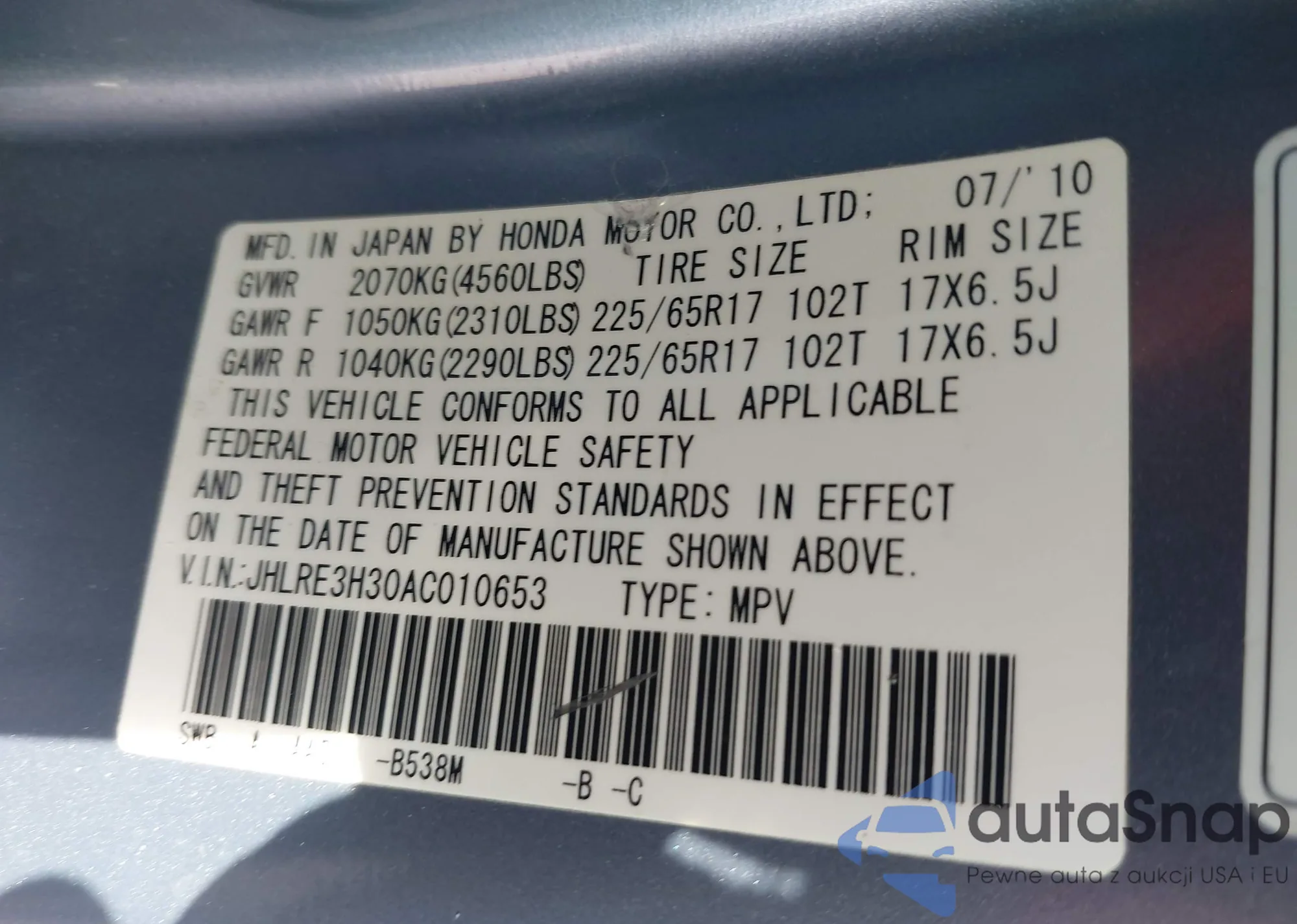 Samochód Honda CR-V 2010 (VIN JHLRE3H30AC010653) nie był wcześniej licytowany. Dokumenty są czyste, przebieg odpowiada lub jest niższy niż średnia rynku. Sprzedaje go firma ubezpieczeniowa – polecamy zakup. Dostawa do portu zajmie ok. 6–8 tygodni.