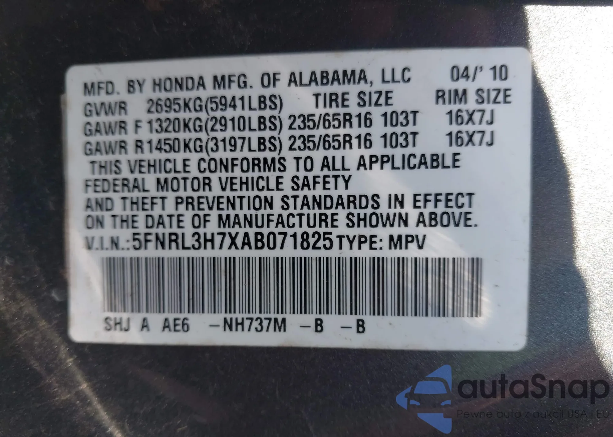 VIN: 5FNRL3H7XAB071825