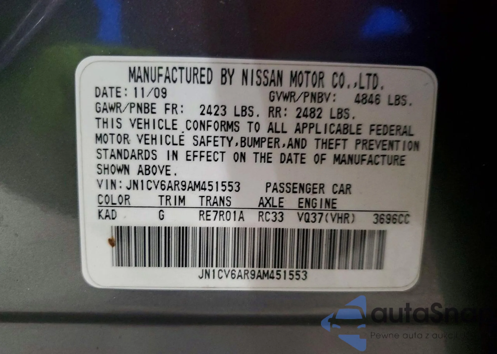 Samochód Infiniti G 2010 (VIN JN1CV6AR9AM451553) sprzedaje go niezweryfikowany sprzedawca. Zalecamy raport Carfax i potwierdzenie możliwości rejestracji pojazdu przed zakupem.