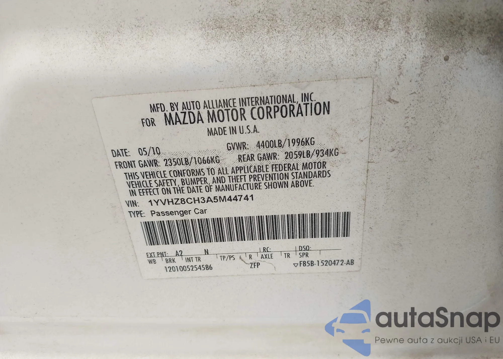 • VIN: 1YVHZ8CH3A5M44741