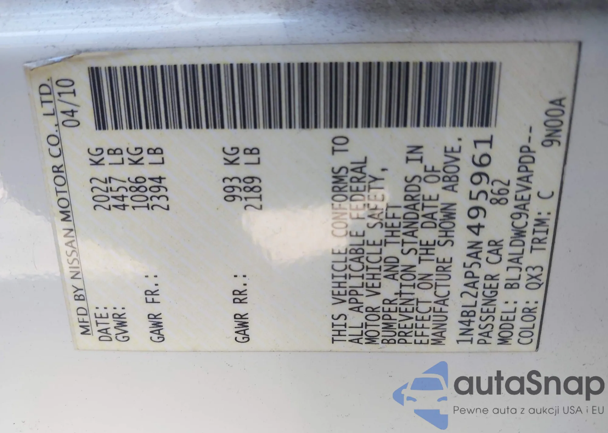 Samochód Nissan Altima 2010 (VIN 1N4BL2AP5AN495961) nie był wcześniej licytowany. Dokumenty są czyste, przebieg odpowiada lub jest niższy niż średnia rynku. Sprzedaje go firma ubezpieczeniowa – polecamy zakup. Dostawa do portu zajmie ok. 6–8 tygodni.