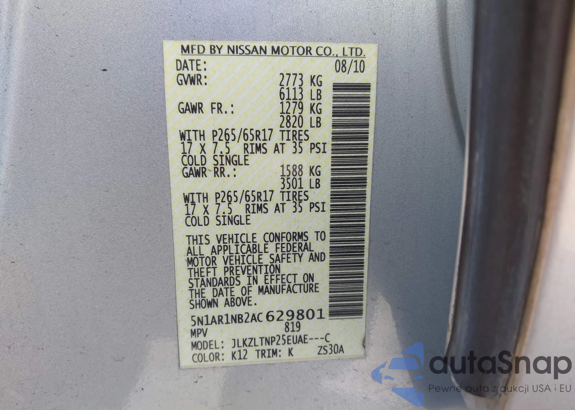 • VIN: 5N1AR1NB2AC629801