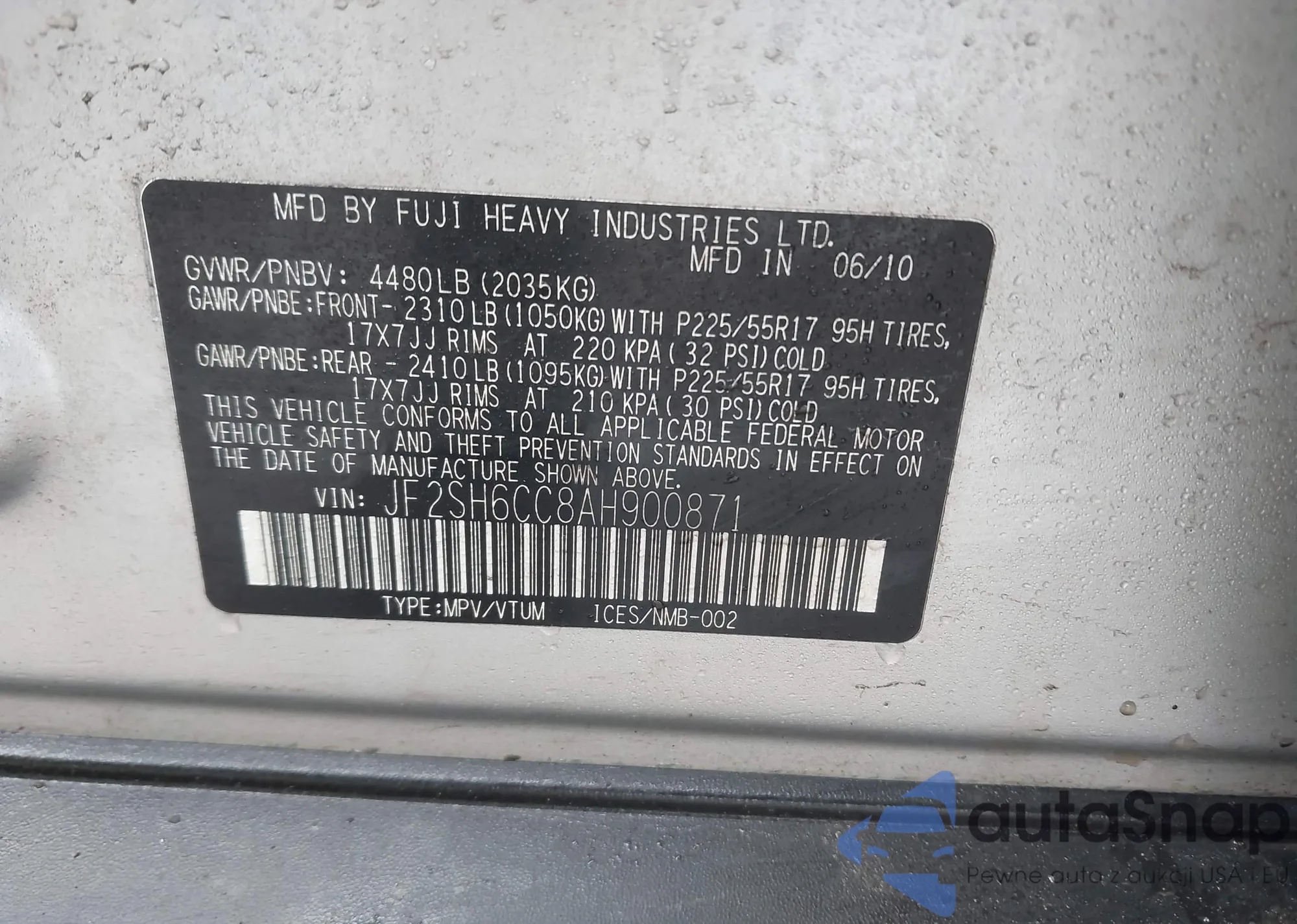 • VIN: JF2SH6CC8AH900871