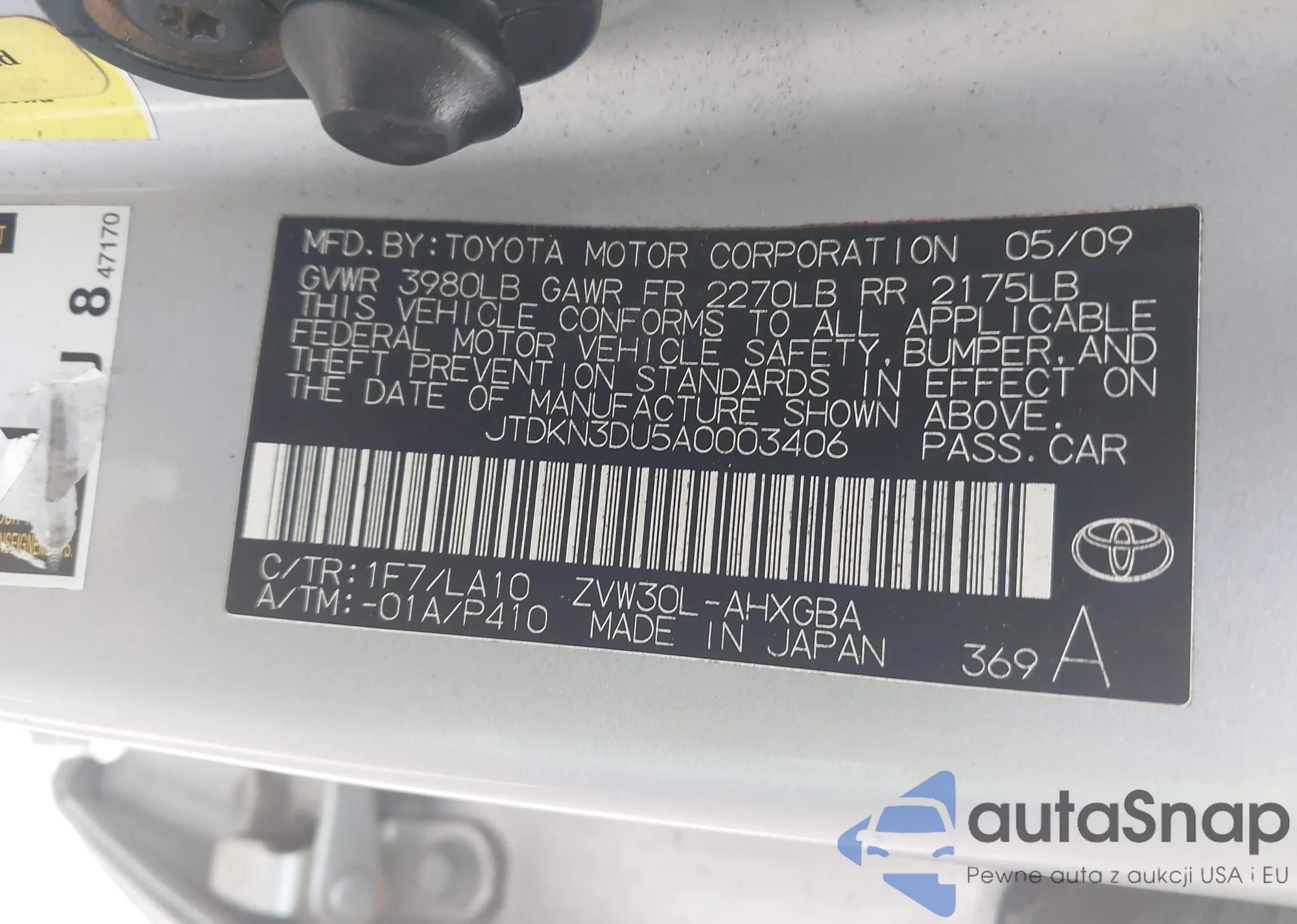 Samochód Toyota Prius 2010 (VIN JTDKN3DU5A0003406) nie był wcześniej licytowany. Dokumenty są czyste, przebieg odpowiada lub jest niższy niż średnia rynku. Sprzedaje go firma ubezpieczeniowa – polecamy zakup. Dostawa do portu zajmie ok. 6–8 tygodni.