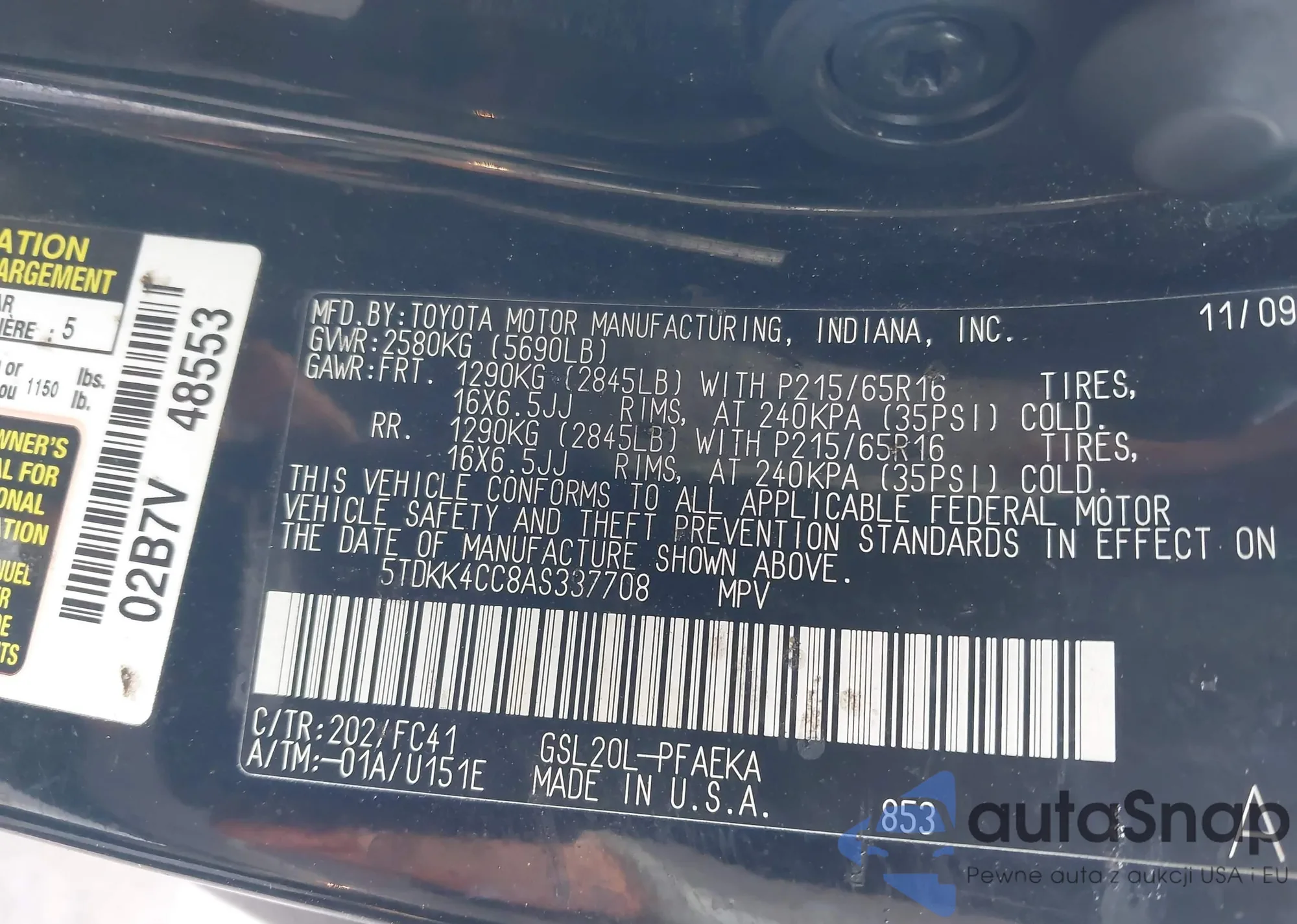 Samochód Toyota Sienna 2010 (VIN 5TDKK4CC8AS337708) nie był wcześniej licytowany. Dokumenty są czyste, przebieg odpowiada lub jest niższy niż średnia rynku. Sprzedaje go firma ubezpieczeniowa – polecamy zakup. Dostawa do portu zajmie ok. 6–8 tygodni.