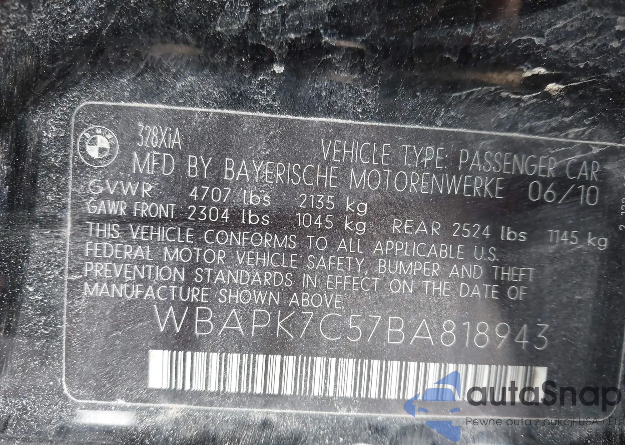 Samochód BMW 3er 2011 (VIN WBAPK7C57BA818943) nie był wcześniej licytowany. Dokumenty są czyste, przebieg odpowiada lub jest niższy niż średnia rynku. Sprzedaje go firma ubezpieczeniowa – polecamy zakup. Dostawa do portu zajmie ok. 6–8 tygodni.