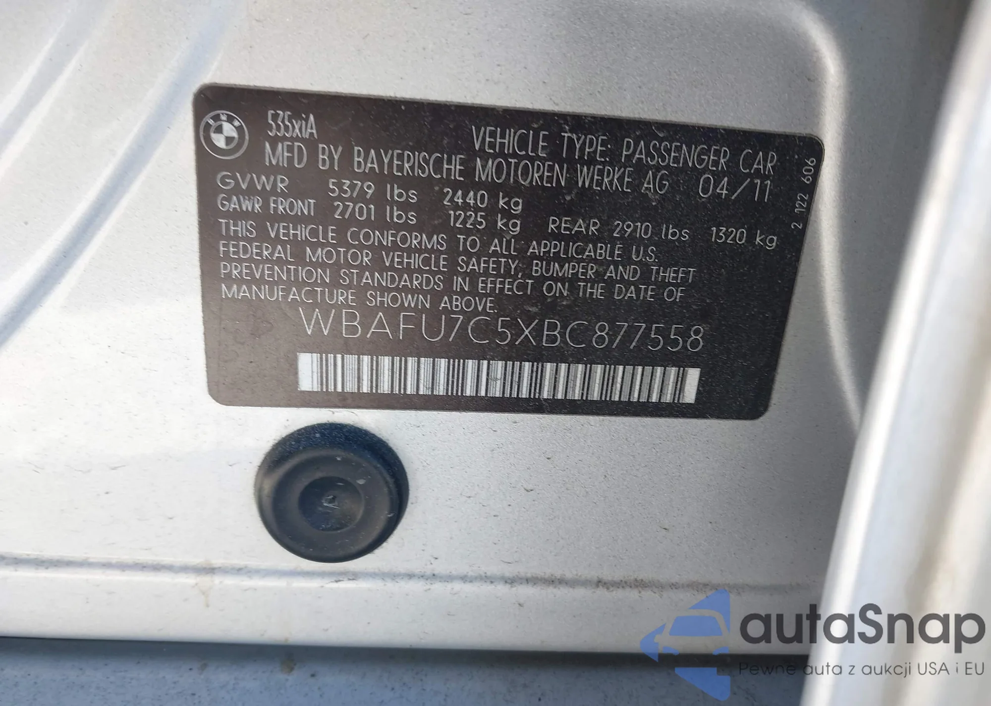 Samochód BMW 5er 2011 (VIN WBAFU7C5XBC877558) nie był wcześniej licytowany. Dokumenty są czyste, przebieg odpowiada lub jest niższy niż średnia rynku. Sprzedaje go firma ubezpieczeniowa – polecamy zakup. Dostawa do portu zajmie ok. 6–8 tygodni.