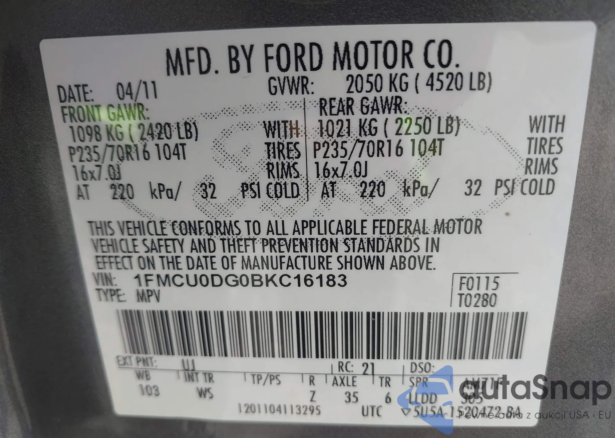• VIN: 1FMCU0DG0BKC16183