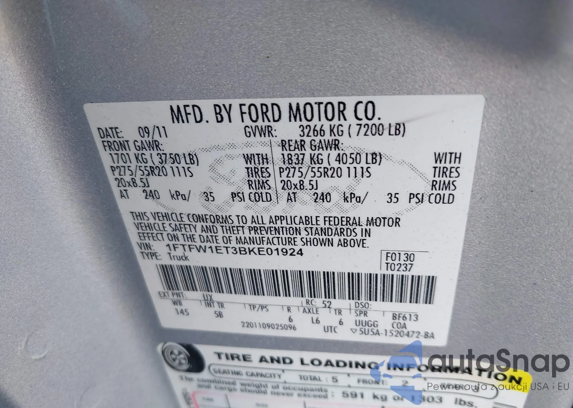 Samochód Ford F-150 2011 (VIN 1FTFW1ET3BKE01924) nie był wcześniej licytowany. Dokumenty są czyste, przebieg odpowiada lub jest niższy niż średnia rynku. Sprzedaje go firma ubezpieczeniowa – polecamy zakup. Dostawa do portu zajmie ok. 6–8 tygodni.