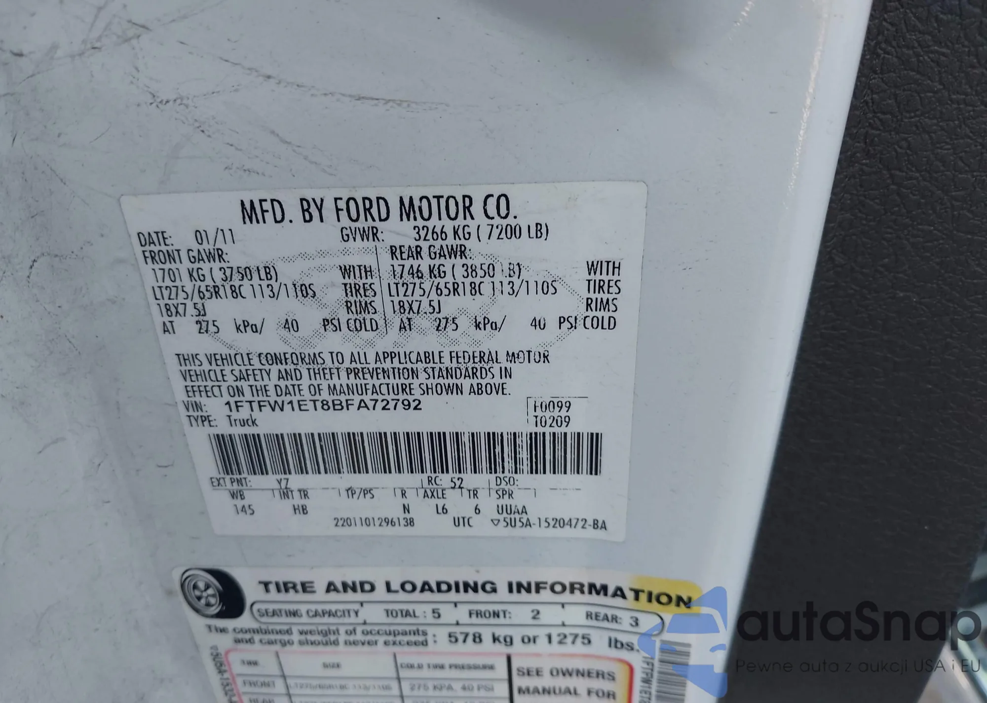 Samochód Ford F-150 2011 (VIN 1FTFW1ET8BFA72792) nie był wcześniej licytowany. Dokumenty są czyste, przebieg odpowiada lub jest niższy niż średnia rynku. Sprzedaje go firma ubezpieczeniowa – polecamy zakup. Dostawa do portu zajmie ok. 6–8 tygodni.