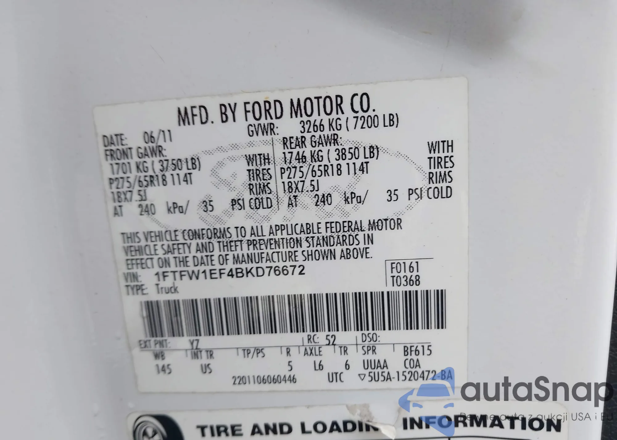 Samochód Ford F-150 2011 (VIN 1FTFW1EF4BKD76672) sprzedaje go niezweryfikowany sprzedawca. Zalecamy raport Carfax i potwierdzenie możliwości rejestracji pojazdu przed zakupem.