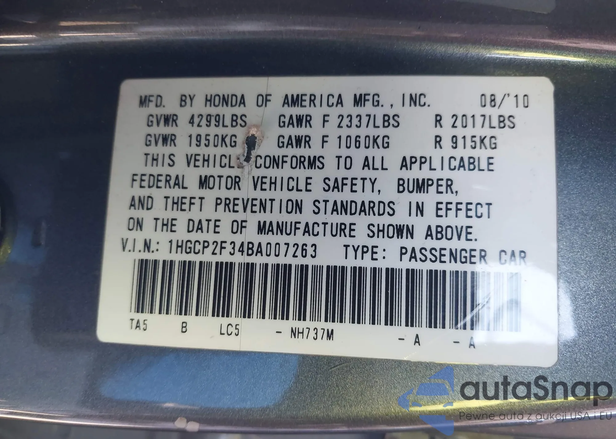 VIN: 1HGCP2F34BA007263