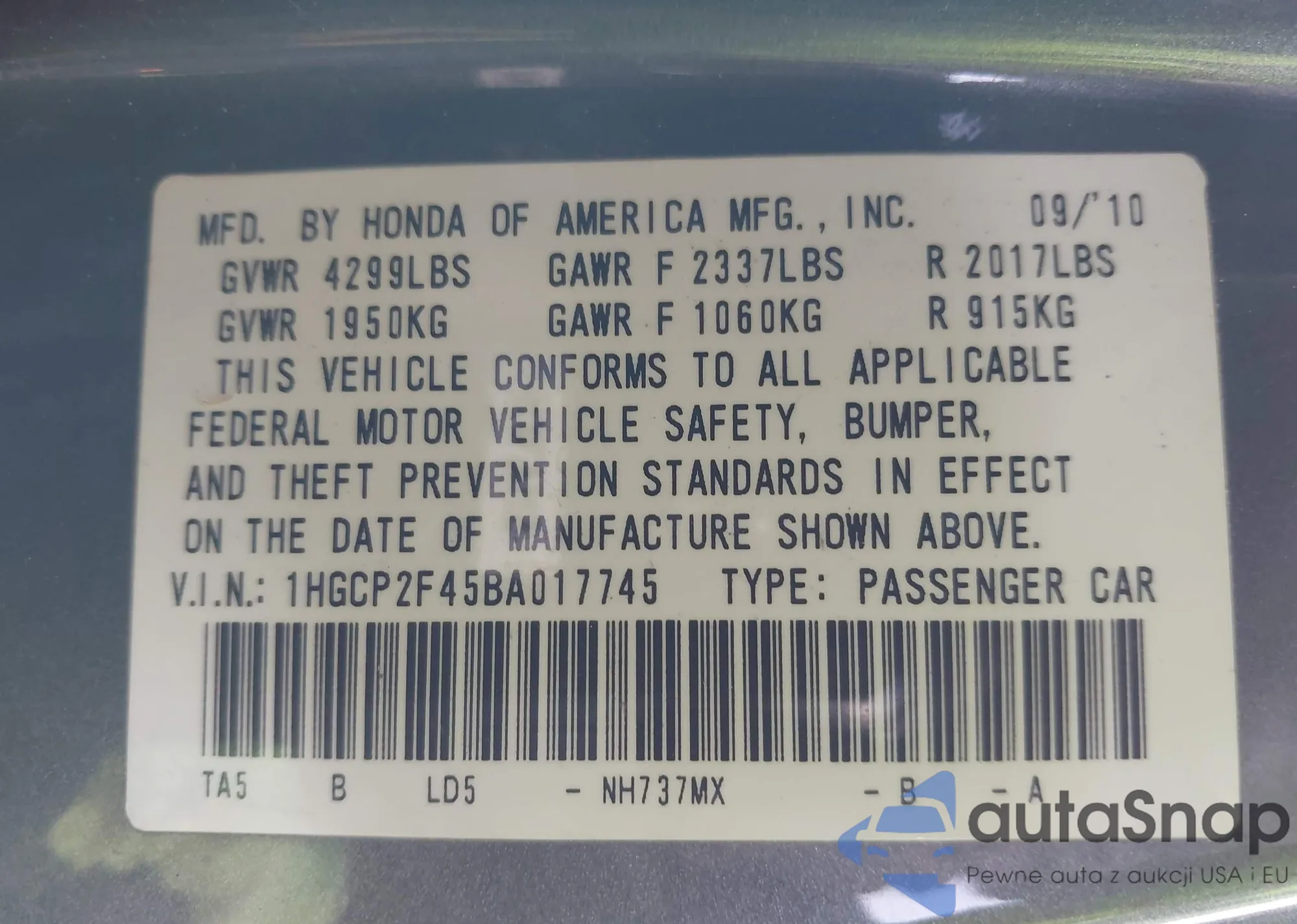 Samochód Honda Accord 2011 (VIN 1HGCP2F45BA017745) ma dokumenty uniemożliwiające rejestrację. Mogą pojawić się trudności przy eksporcie i rejestracji. Skontaktuj się z ekspertami AutaSnap w celu znalezienia alternatywy.